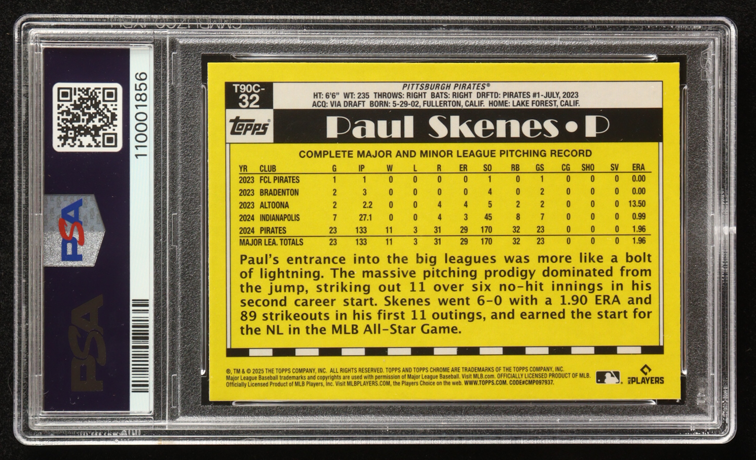 Paul Skenes 2025 Topps '90 Topps Silver Pack Chrome #T90C32 (PSA 9)
