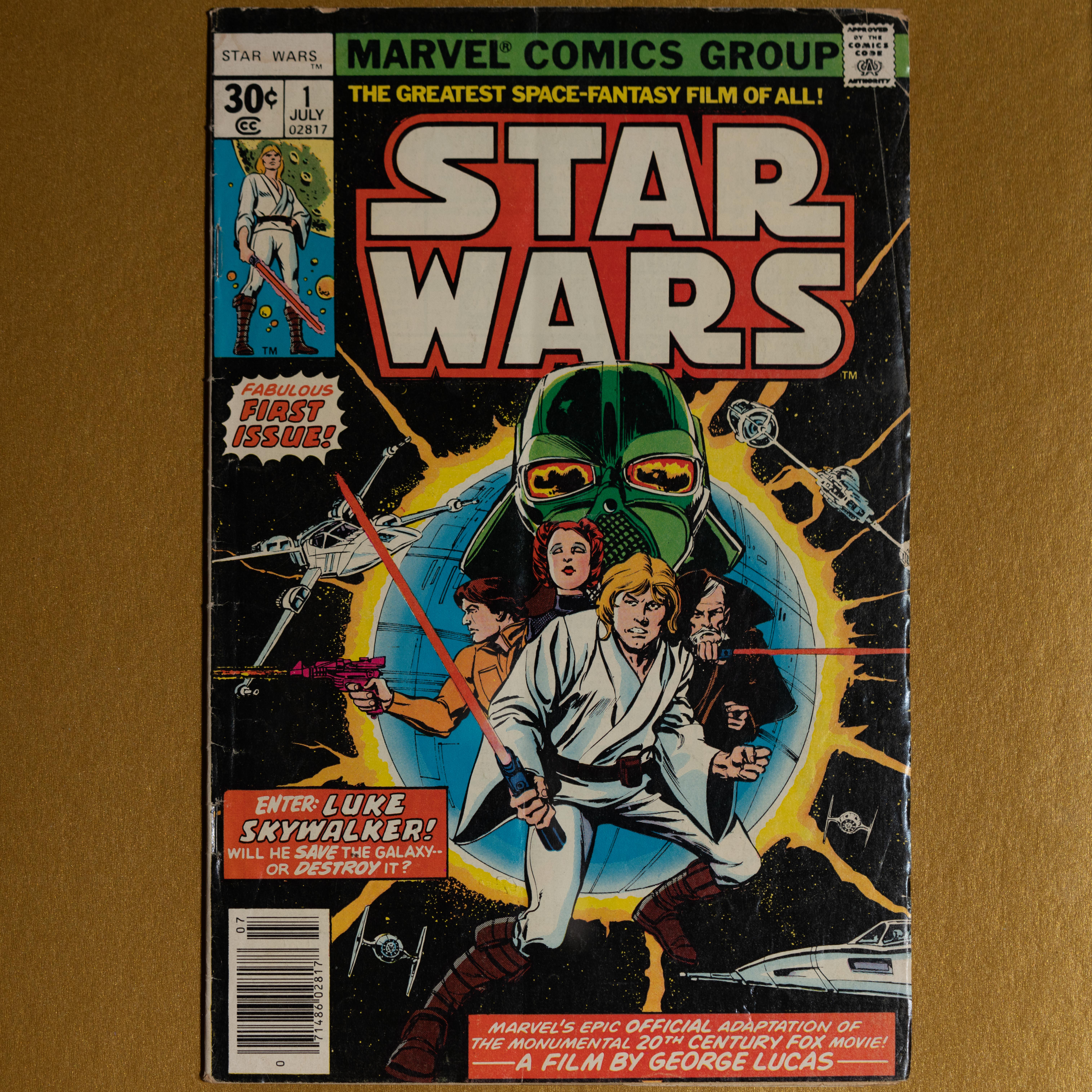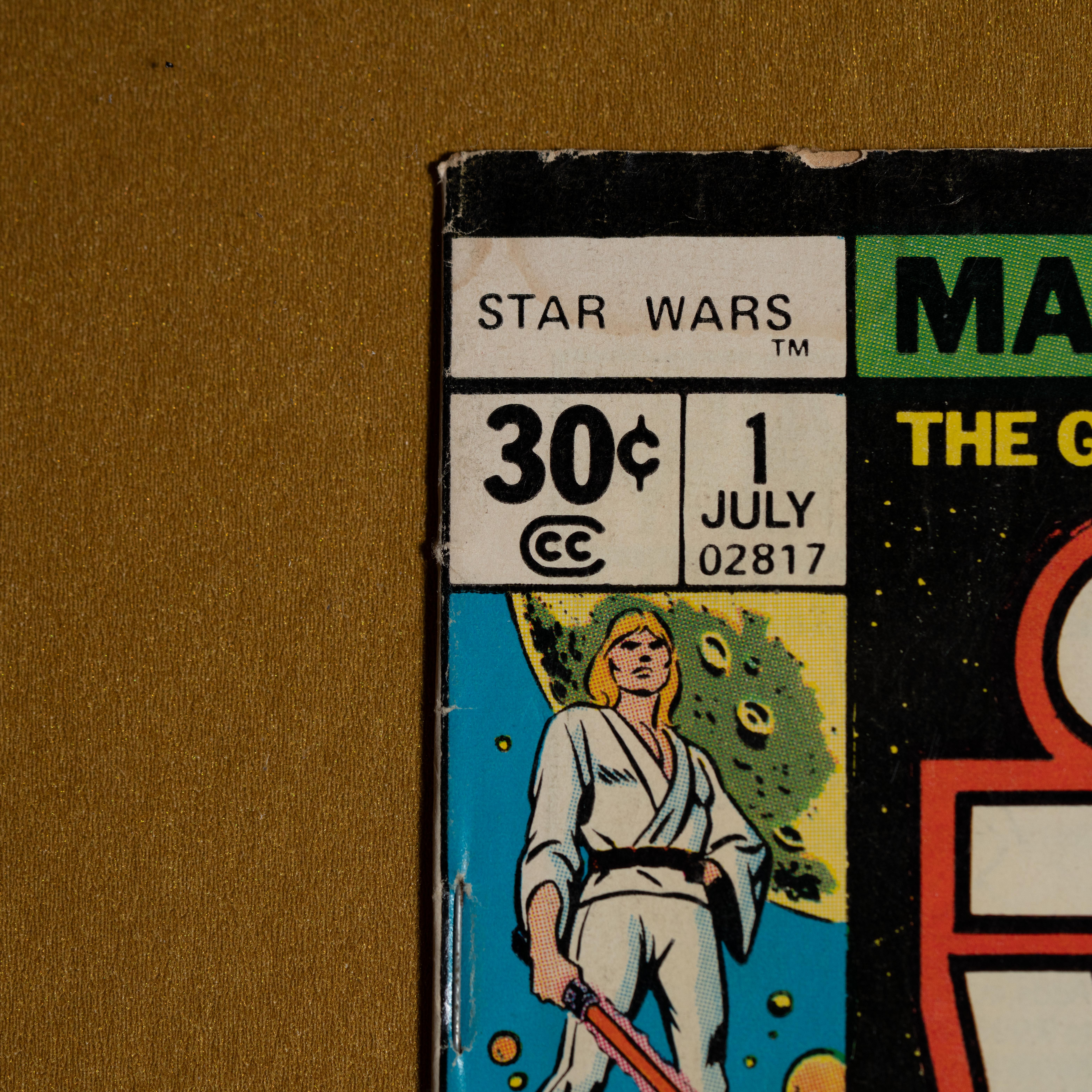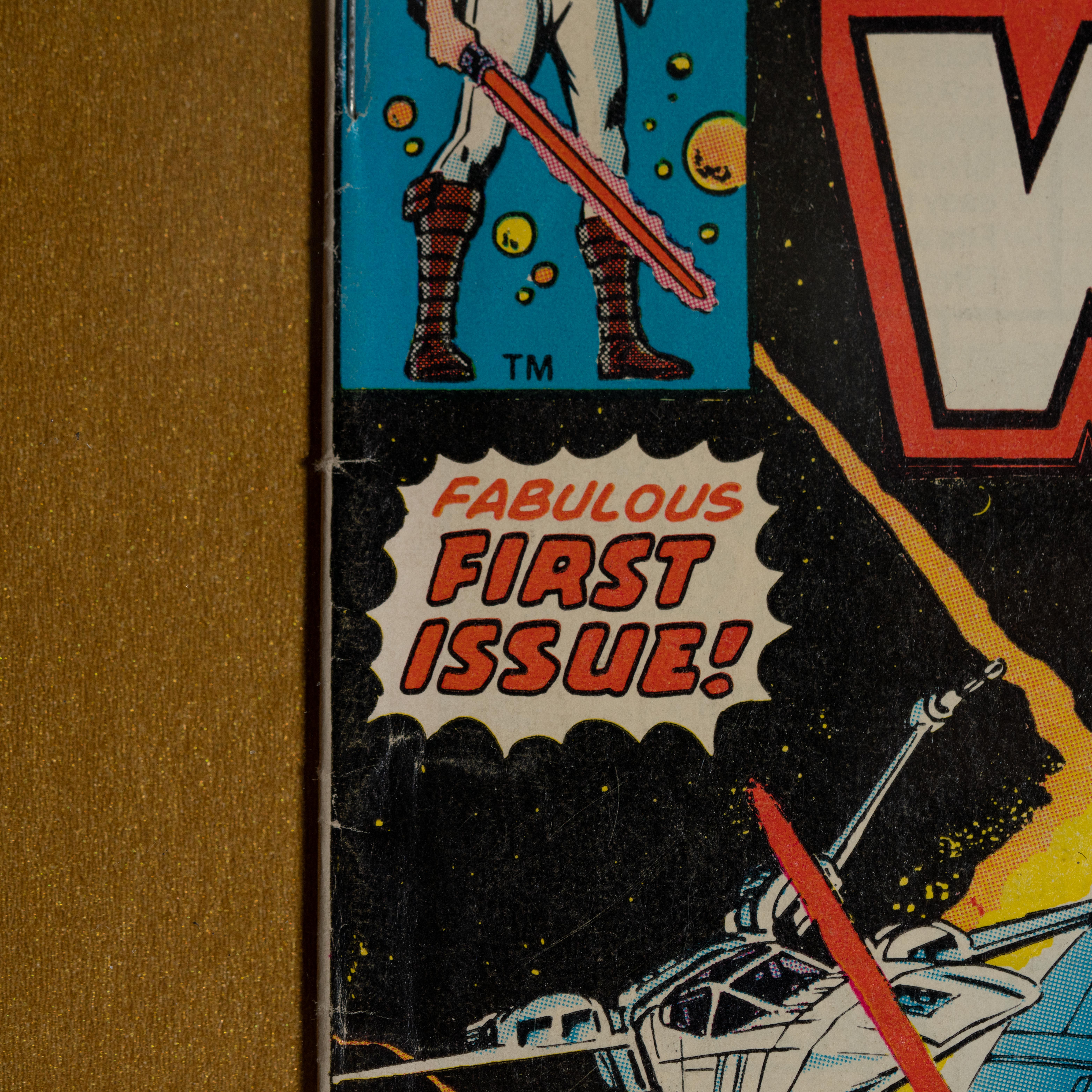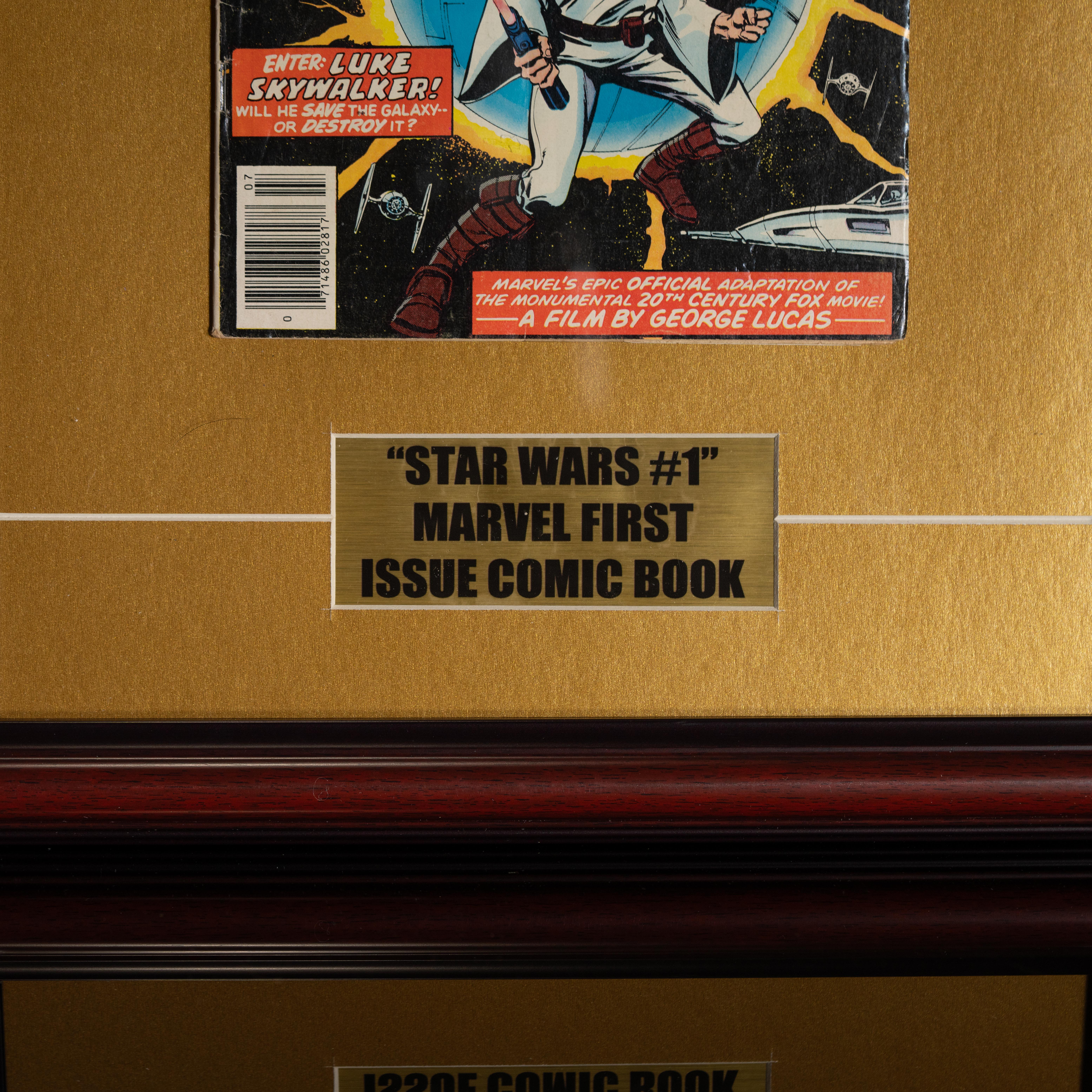 Custom frame measures approximately 13" x 18" in size and features the 1977 "Star Wars" Issue #1 First Issue Marvel Comic Book. Please note, the display is unsigned and includes a title plaque.