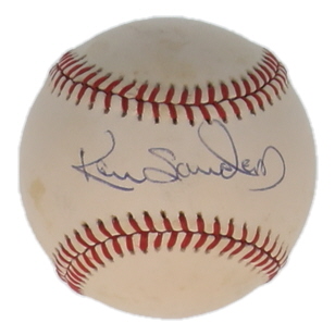 Rawlings Official National League Baseball. Hand-signed by Ken Sanders (Milwaukee Brewers). Please note, the baseball is naturally toned and stained.