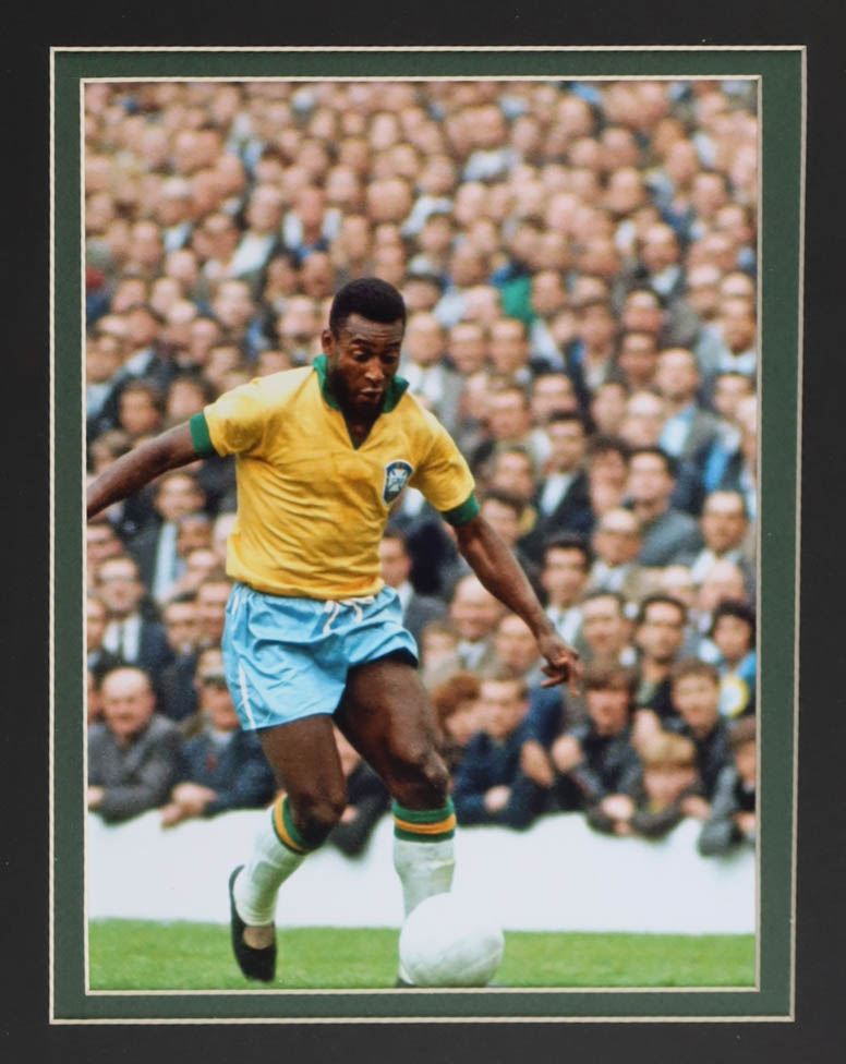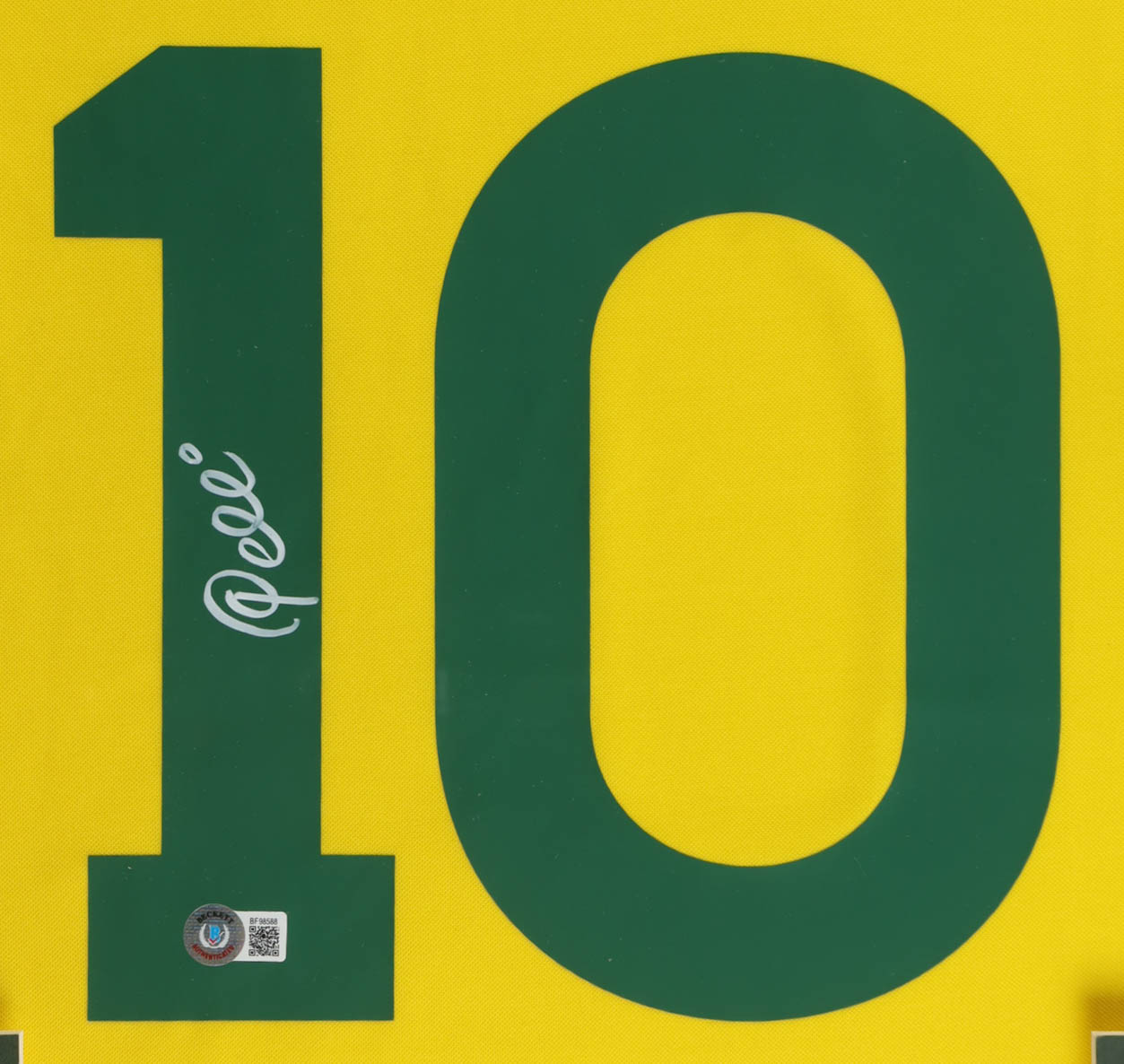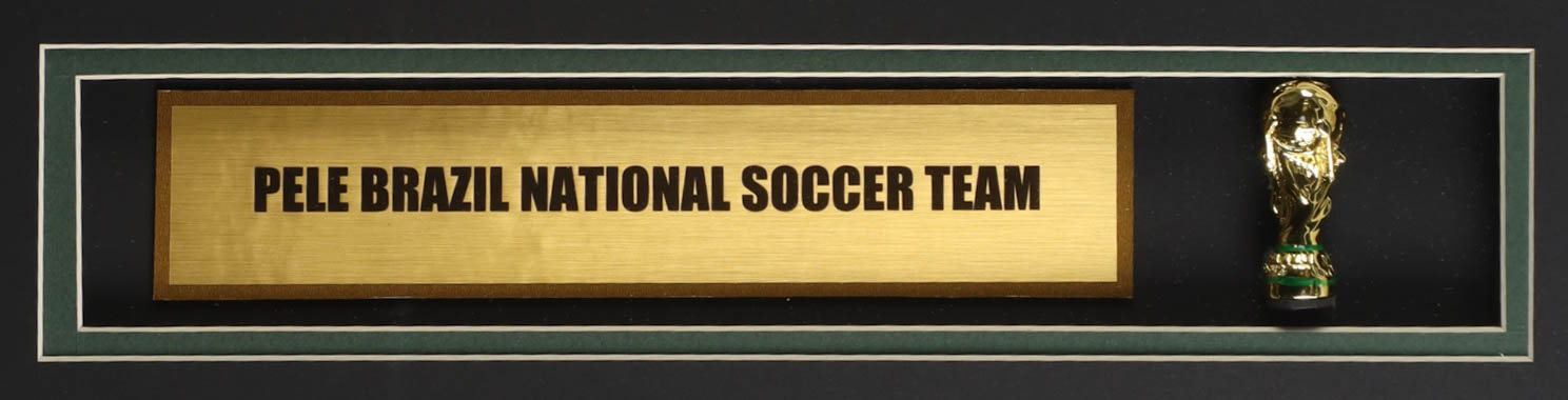 Custom frame measures 35" x 43" in size and features a jersey hand-signed by Pele (D. 2022, HOF). Please note that the 8" x 10" photos may be in reverse order. Display also features a Team Brazil Logo Pin and career statistics plaque.