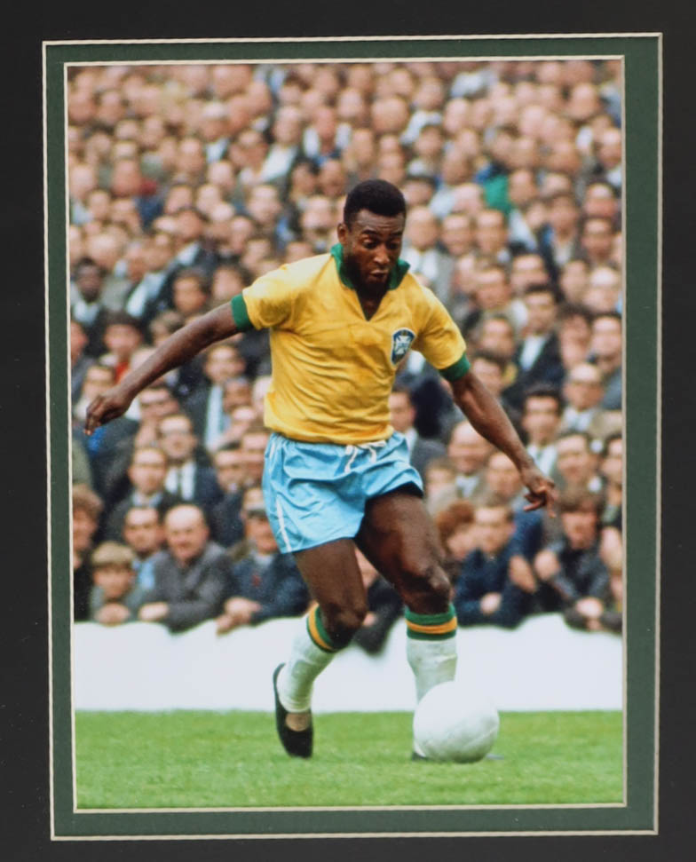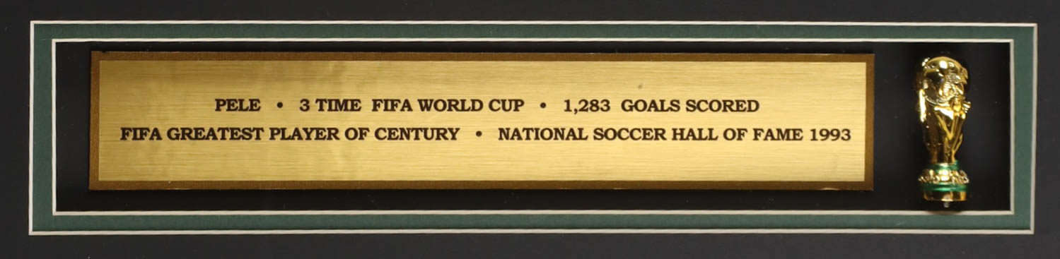 Custom frame measures 35" x 43" in size and features a jersey hand-signed by Pele (D. 2022, HOF). Please note that the 8" x 10" photos may be in reverse order. Display also features a Team Brazil Logo Pin and career statistics plaque.