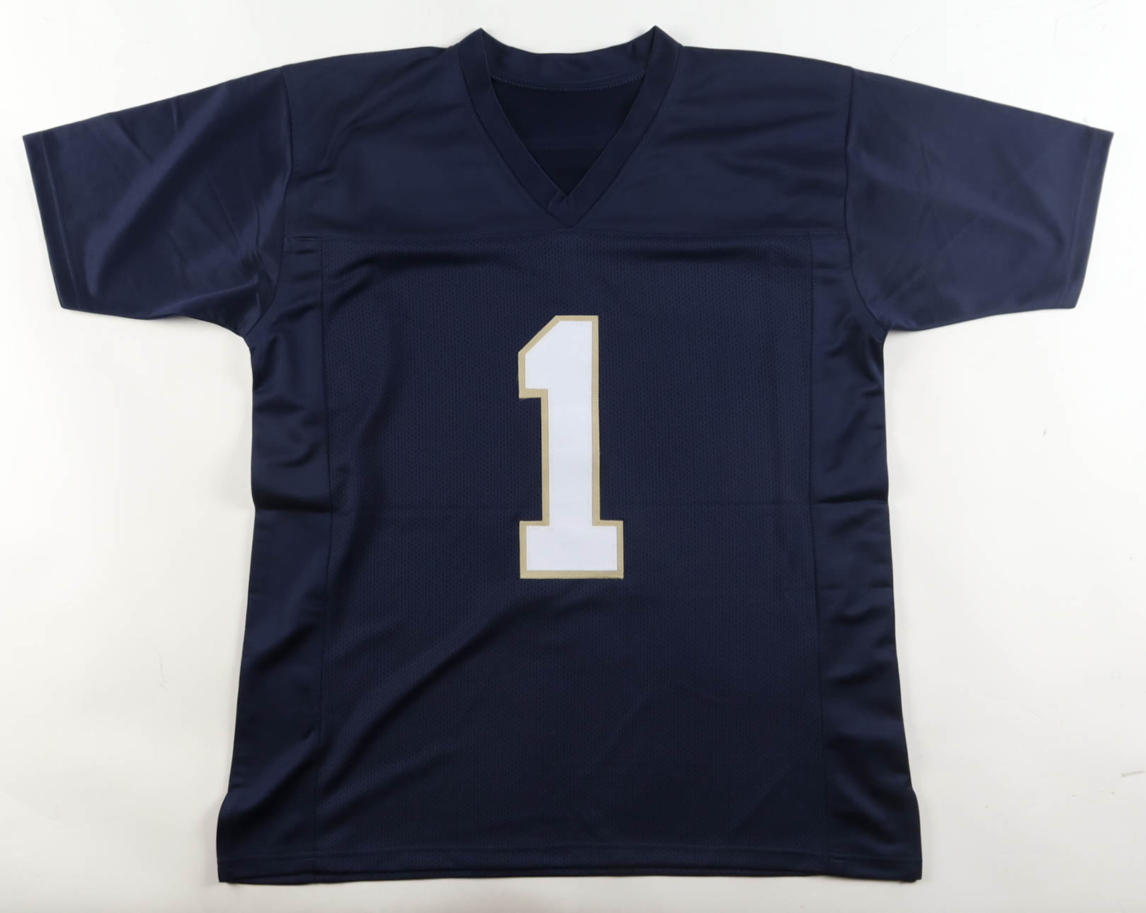 Custom jersey with everything sewn on, size XL. Hand-signed by Lou Holtz. Please note, there is a stain above the hologram and the signature has bled.