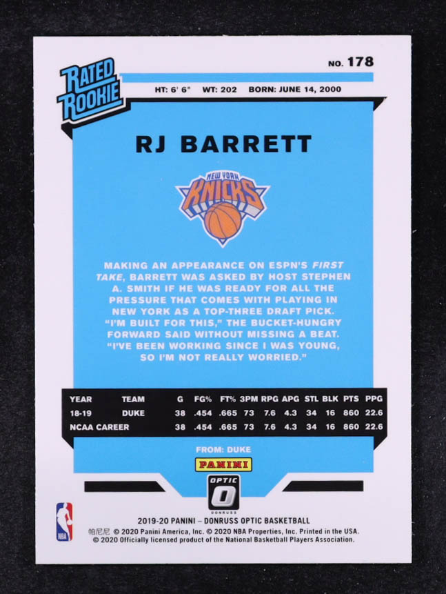 RJ Barrett 2019-20 Donruss Optic #178 RR RC