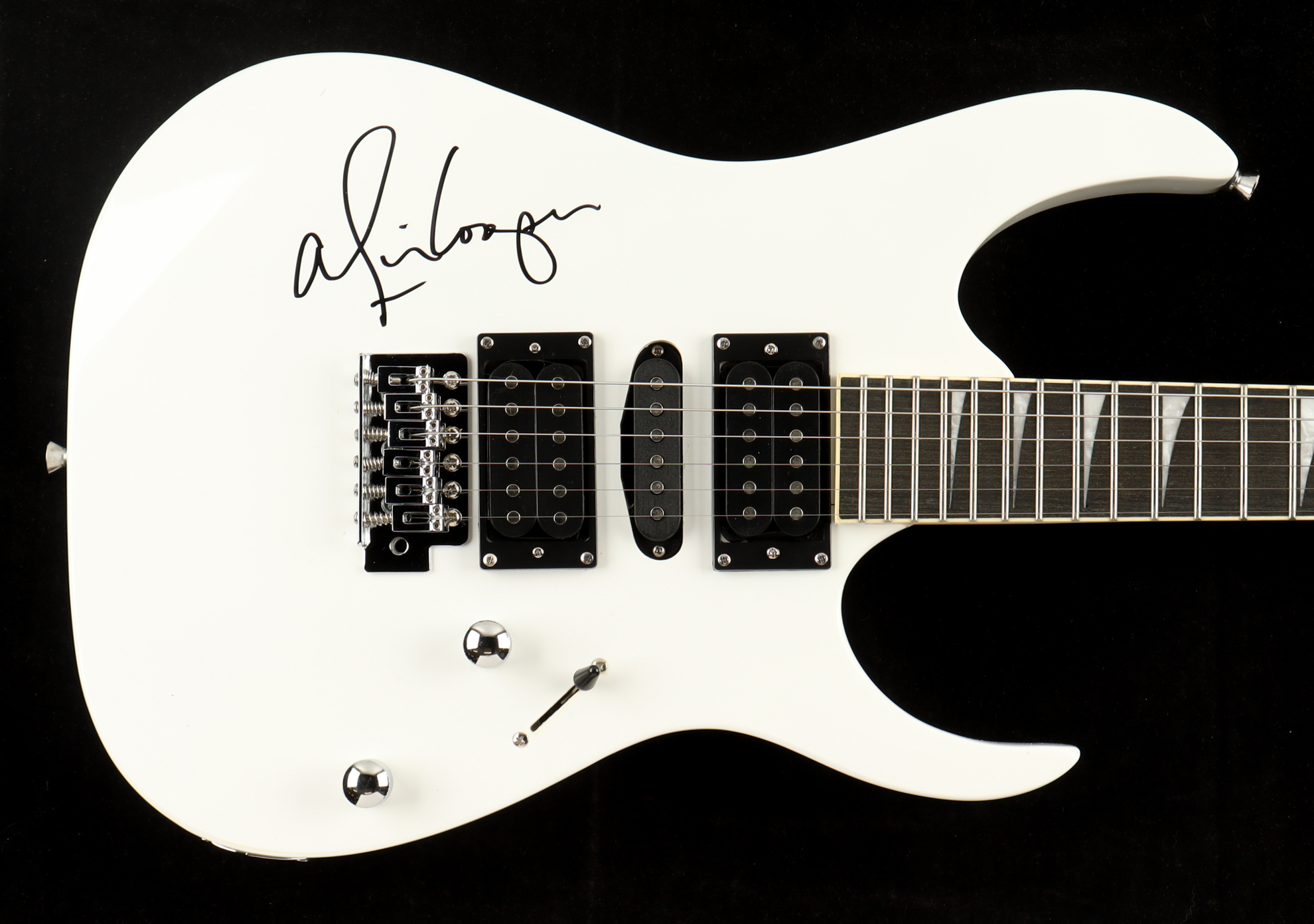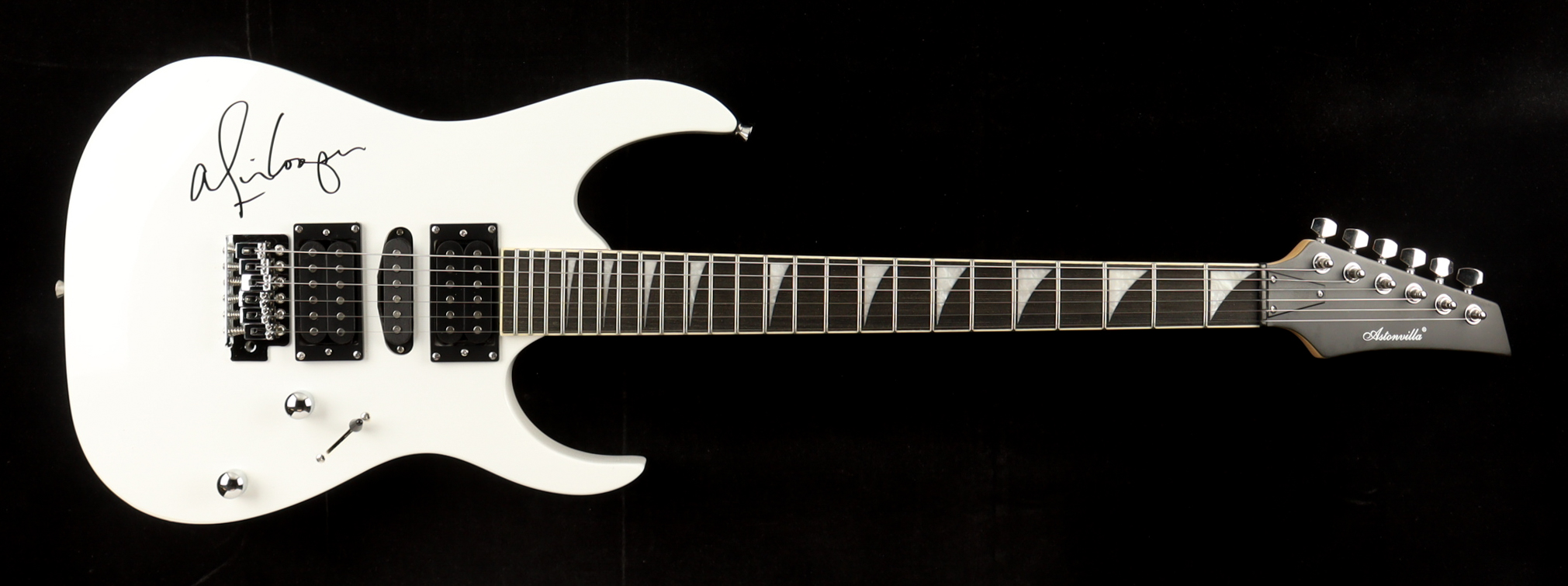 Full-size electric guitar measures approximately 39" in length and is hand-signed on the body by Alice Cooper.