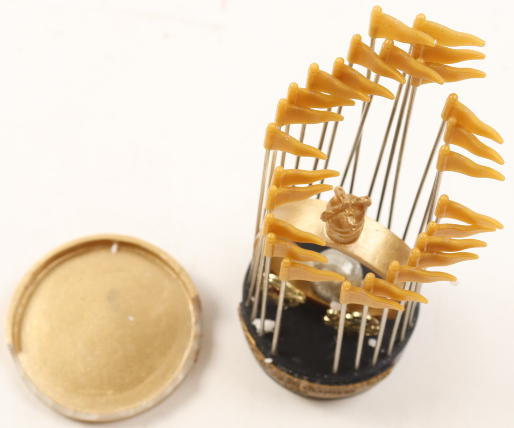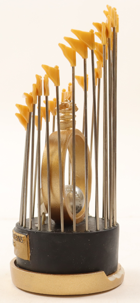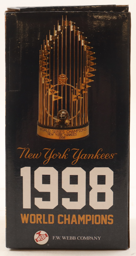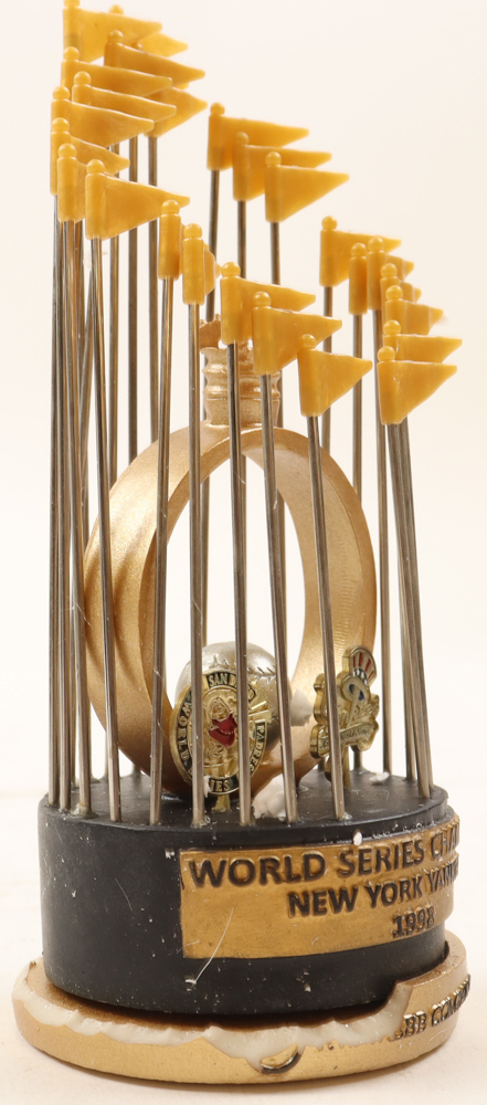 1998 New York Yankees World Series Champion replica trophy measures 6.5" in height. Figurine comes with its original box. Note that the item is unsigned. Please see photos for more details regarding the item as the box and item show slight signs of damage.