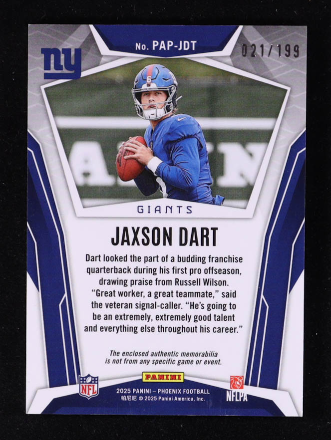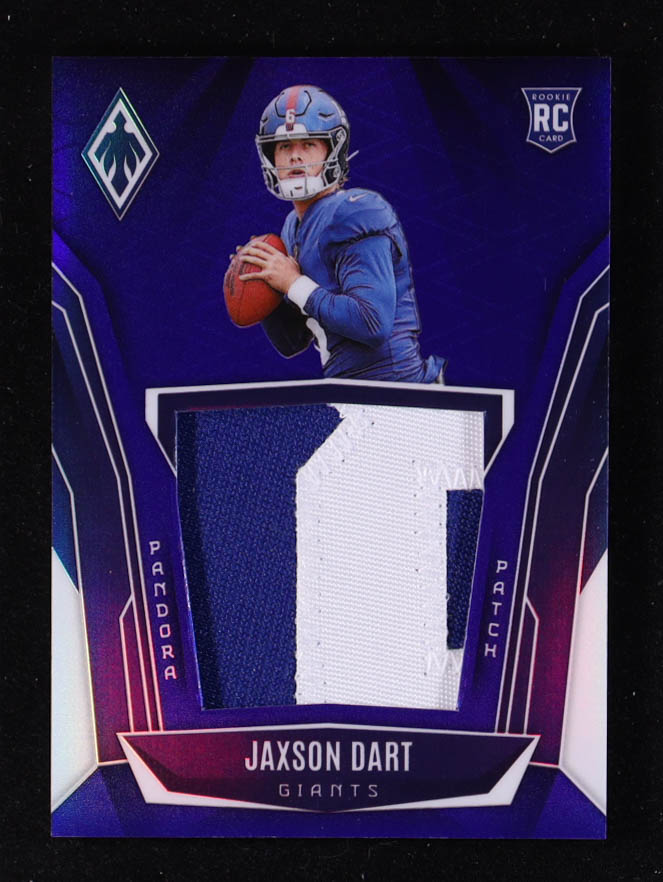 Jaxson Dart 2025 Panini Phoenix Pandora Patches Blue #16 RC #021/199