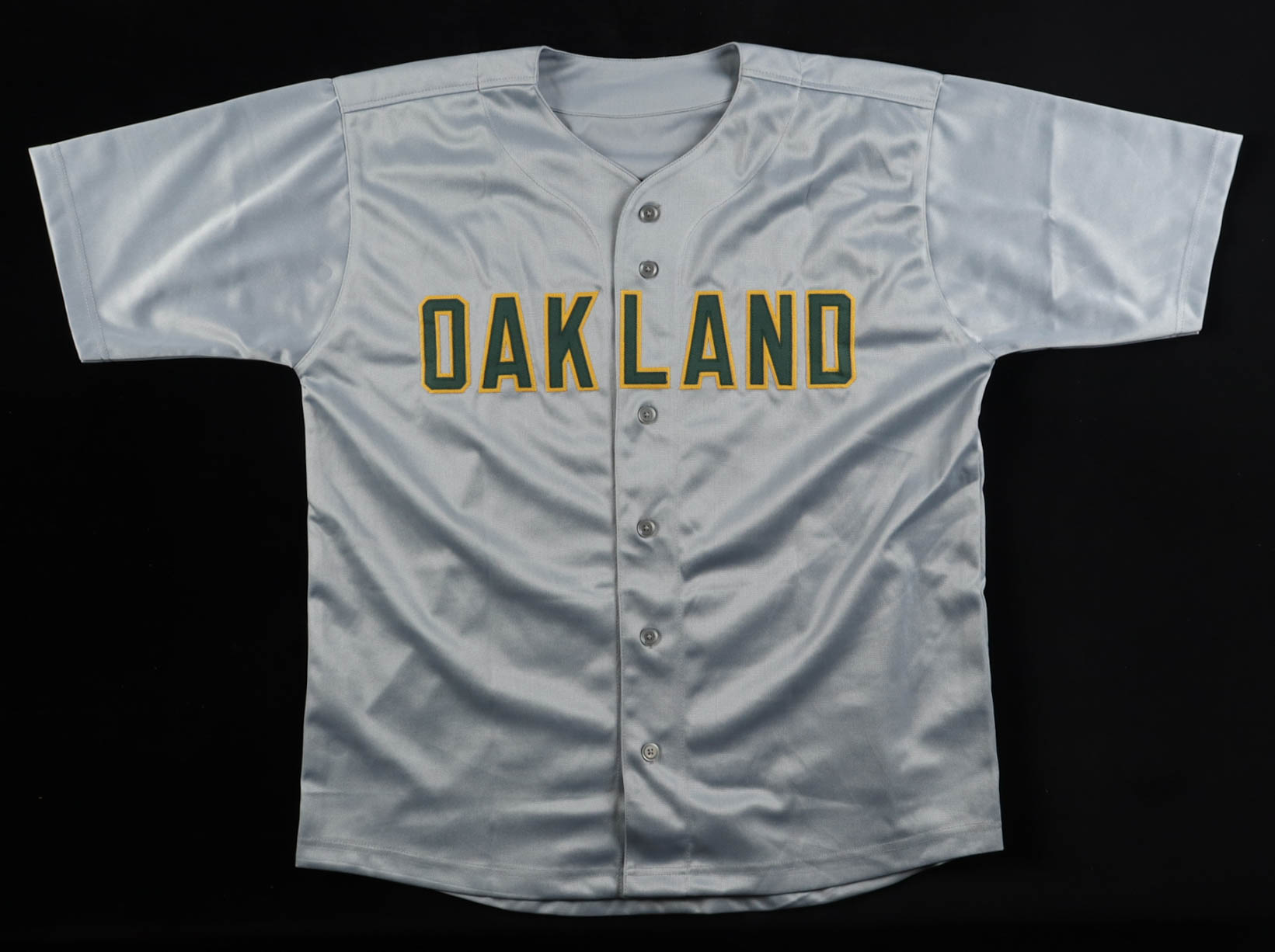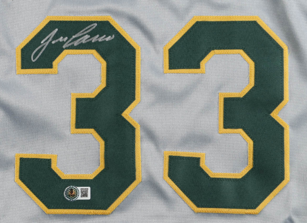 Custom jersey with everything sewn on, size XL. Hand-signed by Jose Canseco (HOF). Canseco's career highlights have been stitched onto the back of the jersey below the reverse numbers.
