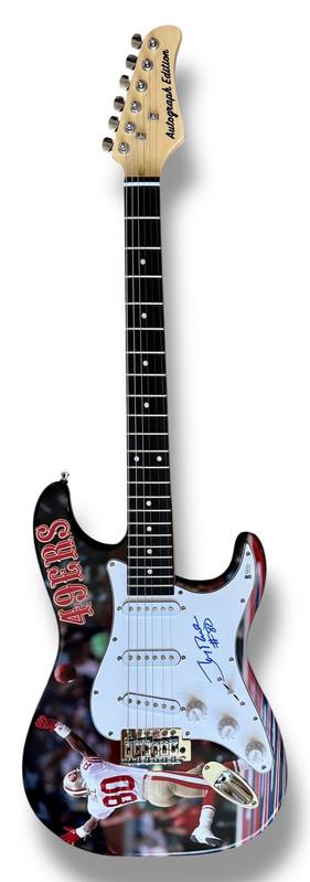 Custom Autograph Edition Stratocaster style electric guitar measures approximately 39" in length and has been hand-signed on the pickguard by Jerry Rice (San Francisco 49ers, HOF).
