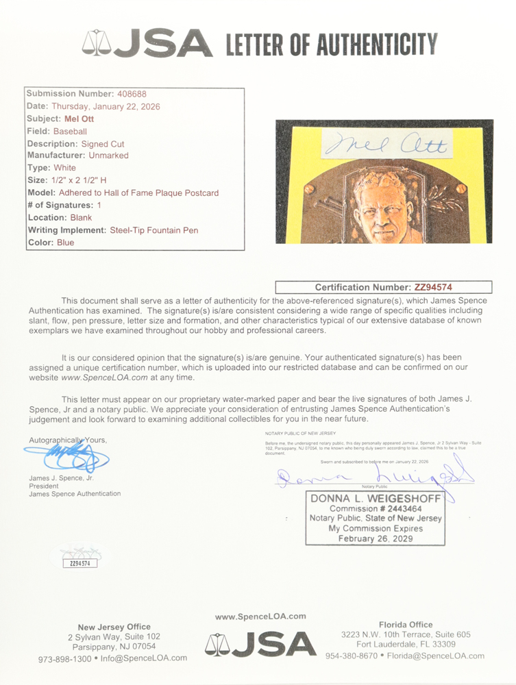 Mel Ott Signed Cut on Hall of Fame Plaque Postcard (JSA)