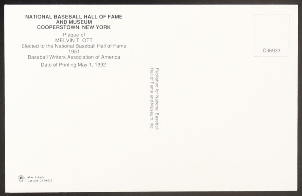 National Baseball Hall Of Fame Postcard that has been hand-signed on a cut by Mel Ott (D. 1958, New York Giants, HOF).