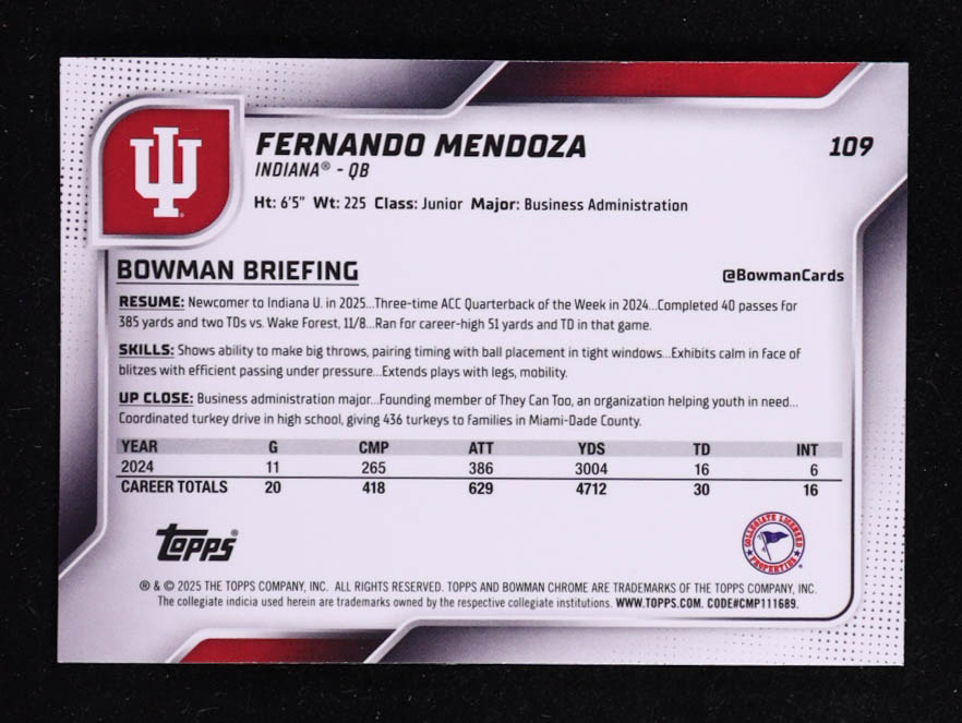 Fernando Mendoza 2025 Bowman Chrome University Pink Lava Refractors #109 RC