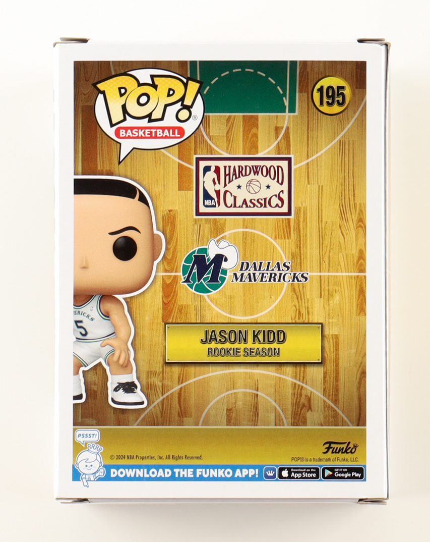Funko Pop! vinyl figure measures approximately 4" in height and has been hand-signed on the packaging by Jason Kidd (Dallas Mavericks). Please note, the window has been swapped.