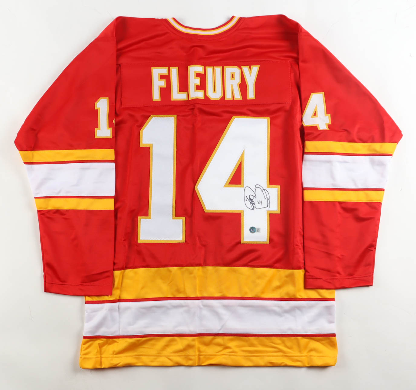 Custom jersey with everything sewn on, size XL. Has been hand-signed by Theoren Fleury.