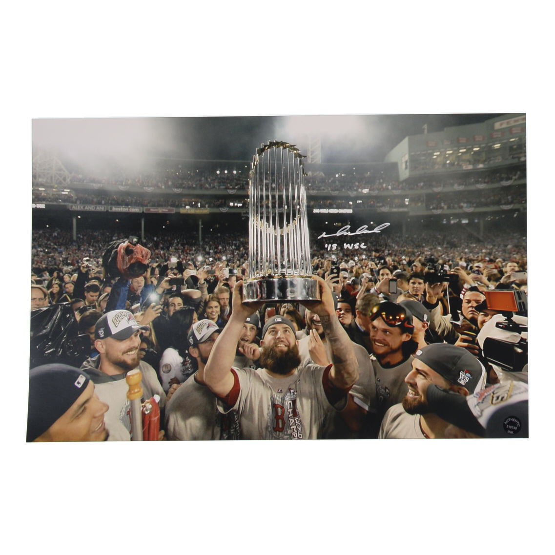 Photograph measures 11" x 17" in size and has been hand-signed and inscribed by Mike Napoli (Boston Red Sox).