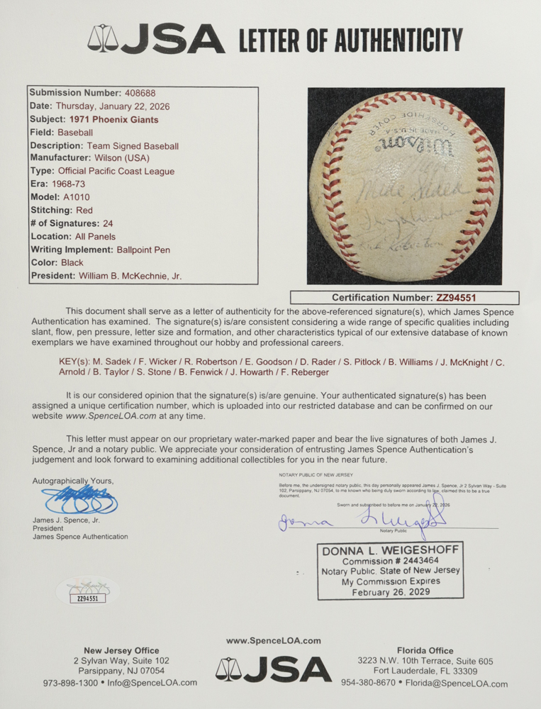 1971 Phoenix Giants | OPCL Baseball Team-Signed by (24) with Mike Sadek, Floyd Wicker, Rich Robertson, Ed Goodson (JSA)