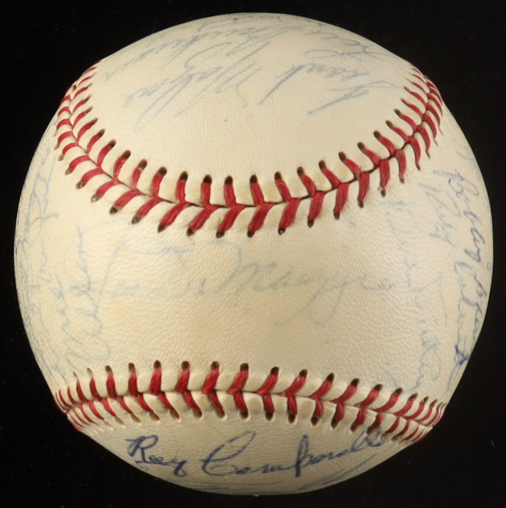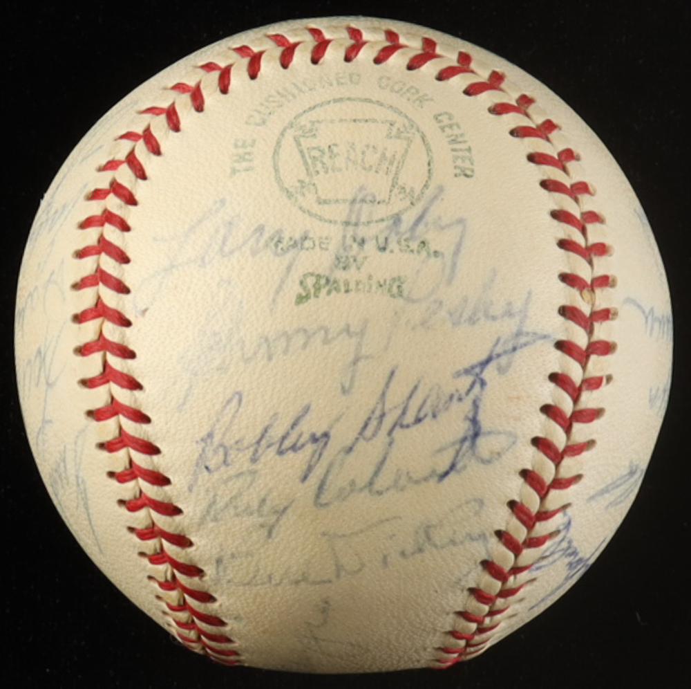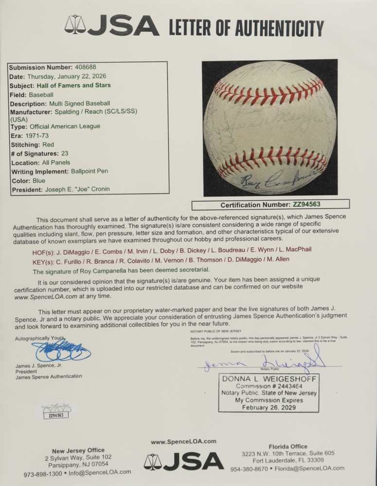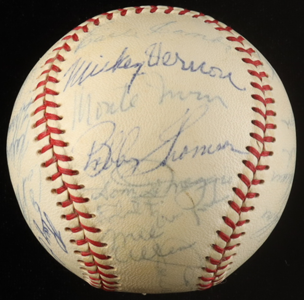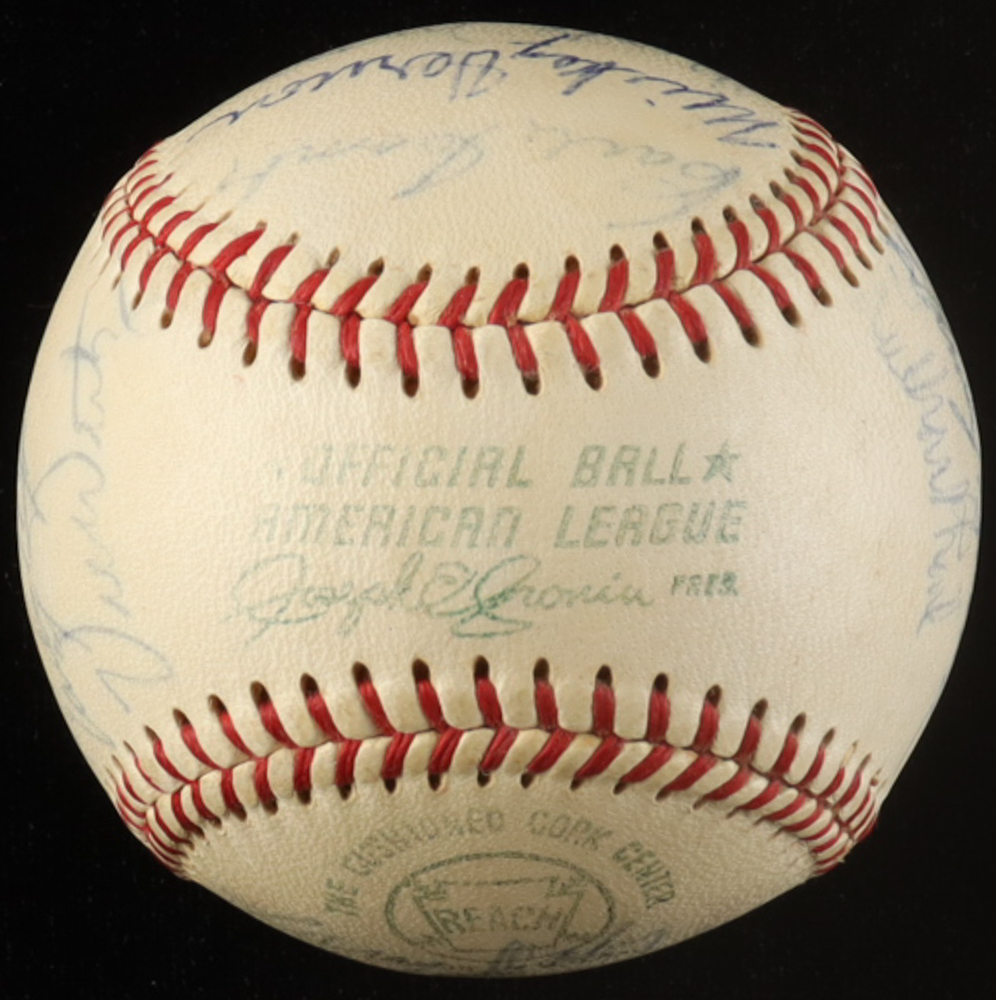 Official American League Baseball has been hand-signed by (23) with Joe DiMaggio, Earle Combs, Monte Irvin, Larry Doby, Bill Dickey, Lou Boudreau, Early Wynn, Lee McPhail, Carl Furillo, Ralph Branca, Rocky Colavito, Mickey Vernon, Bobby Thompson, Dom DiMaggio, Mike Allen and (8) others. Please see photos for details regarding the condition of the item.