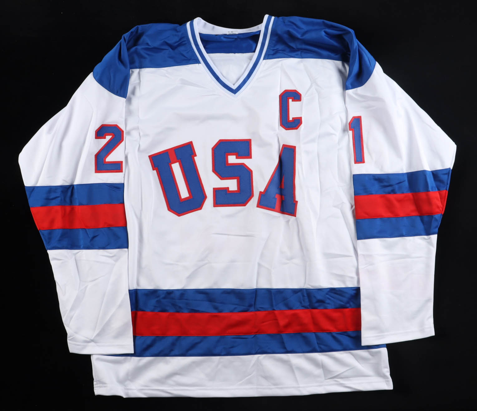 Custom jersey. Everything is sewn on, size XL. Hand-signed and inscribed byPatrick O'Brian Demsey (Mike Eruzione).