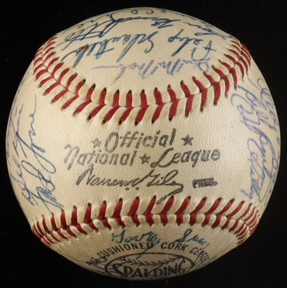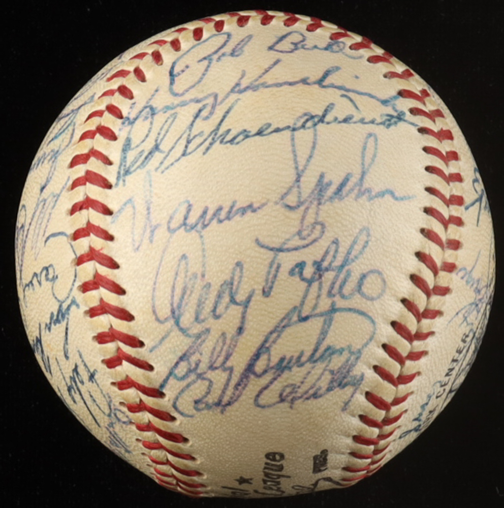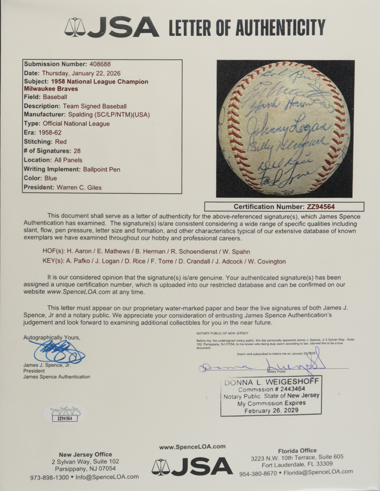 Spalding 1958 Milwaukee Braves NL Champions Official League Baseball has been hand-signed by (28) with Hank Aaron, Eddie Mathews, Billy Herman, Red Schoendienst, Warren Spahn, Andy Pafko, Johnny Logan, Del Rice, Frank Torre, Del Crandall, Joe Adcock, Wes Covington and (16) others. Please see photos for details regarding the condition of the item.