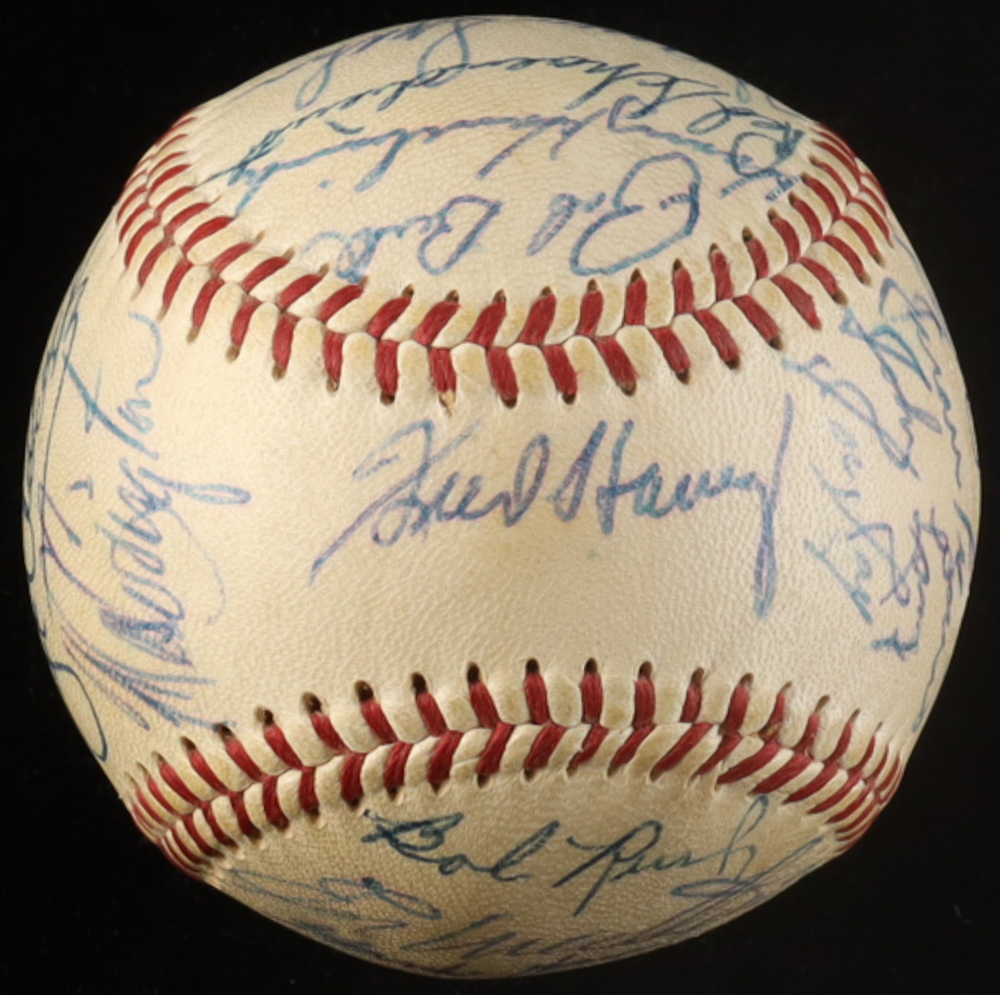 1958 Braves OL Baseball Hand-Signed by (28) with Hank Aaron, Eddie Mathews, Billy Herman, Red Schoendienst (JSA)