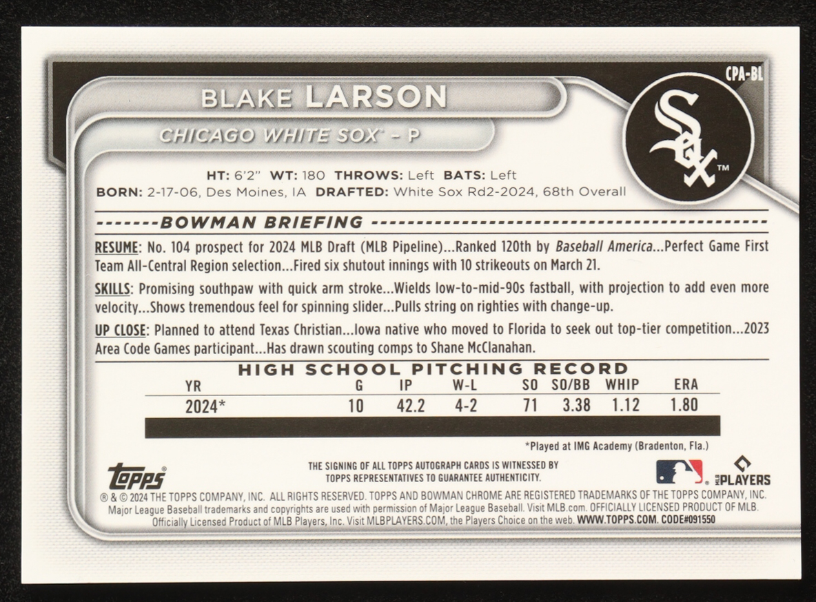 Blake Larson 2024 Bowman Chrome Draft Autographs Gold Refractors #CPABL #27/50