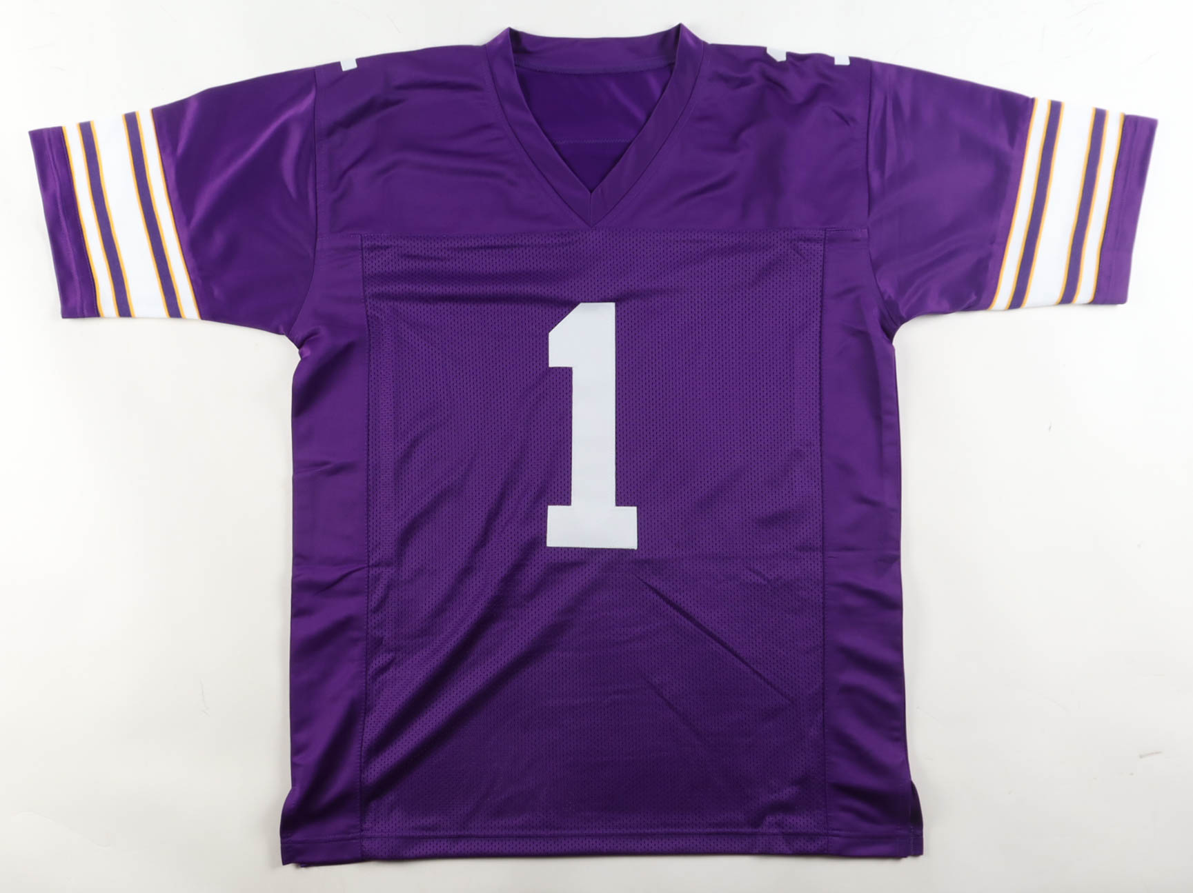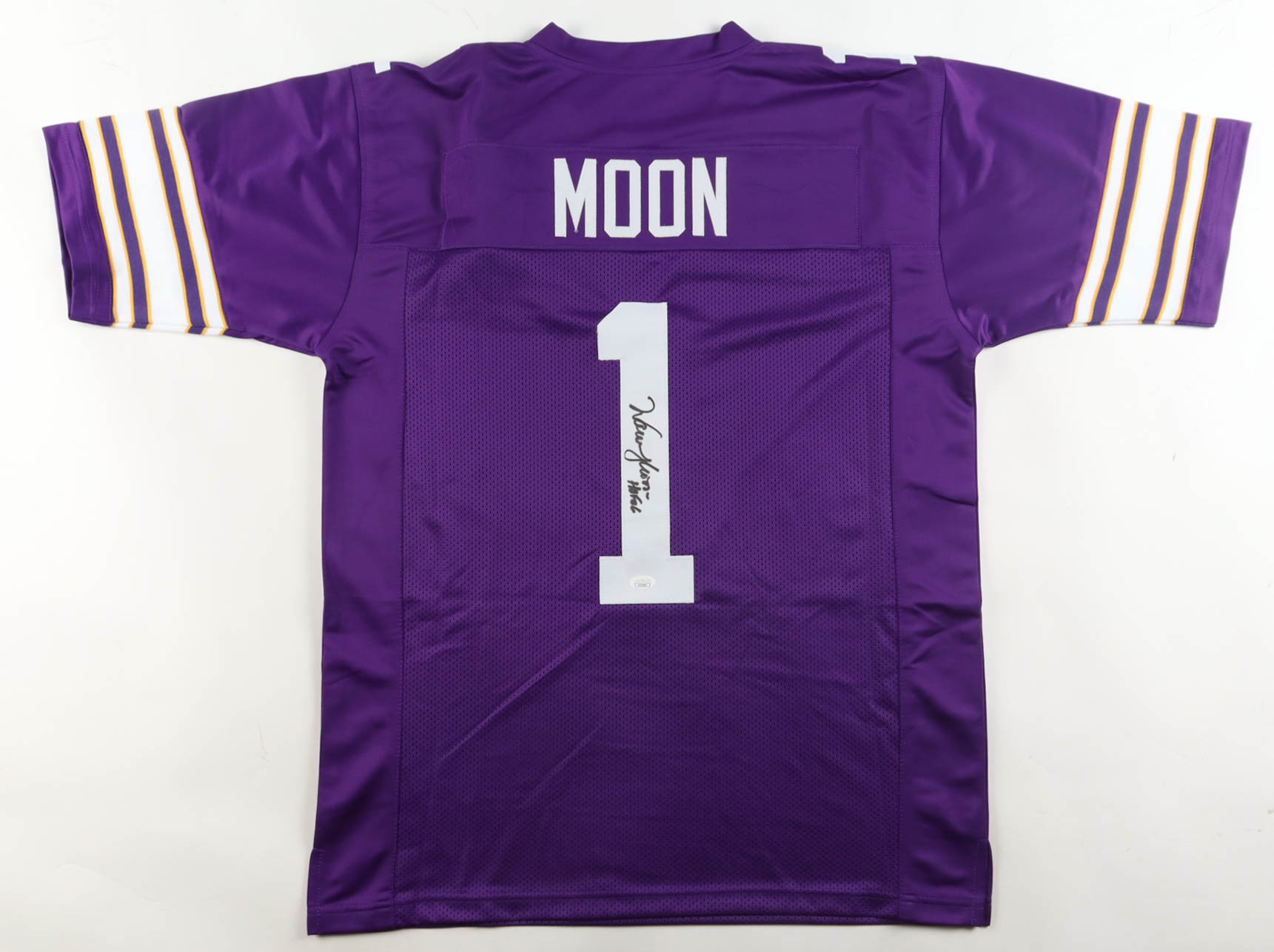 Custom jersey with everything sewn on, size XL. Hand-signed and inscribed by Warren Moon (HOF). Please note, the inscription has bled.