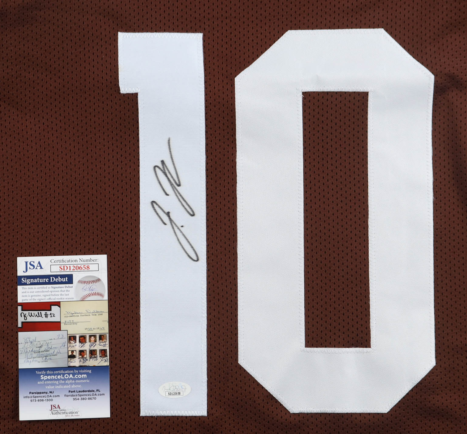 The autograph(s) includes an official James Spence Authentication (JSA) "Signature Debut" hologram and COA. "Signature Debut" is the autographed memorabilia equivalent to a rookie card. The JSA definition of a "Signature Debut" is as follows: "Any item that is autographed and received by JSA prior to the last game of the signer's official rookie season.