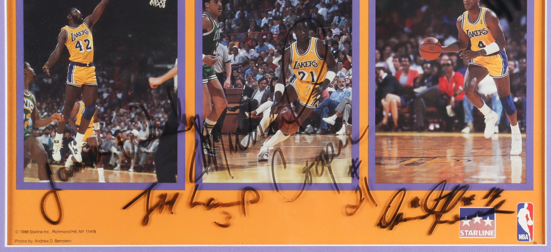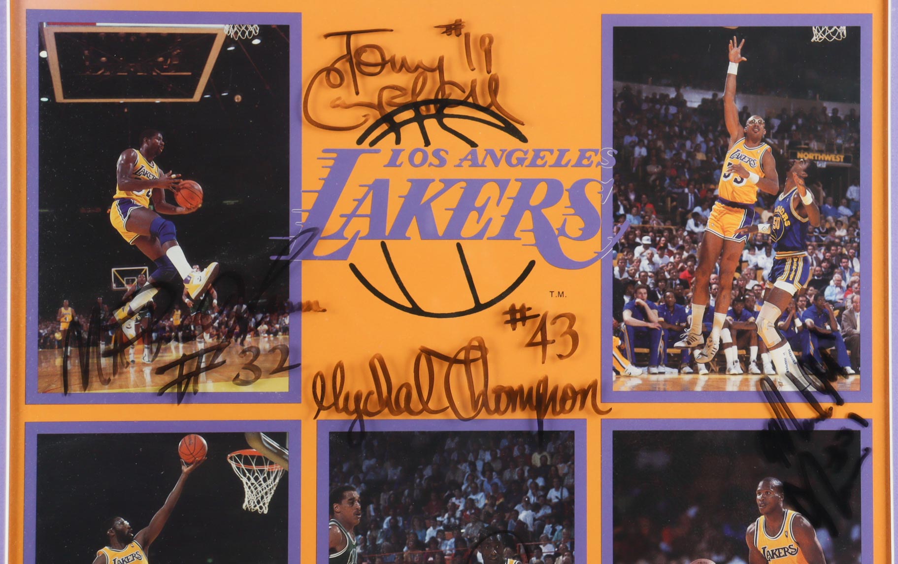 Custom framed display measures 22" x 26" in size. Glass has been hand-signed by Magic Johnson, James Worthy, Michael Cooper, Jim Lamp, Doc Rivers, Mychal Thompson, Tony Campbell, Mike McNamara. Display also includes Starline poster. Please note glass display is signed and over top is another glass layer, frame is fragile, see photos for more details on condition of item.