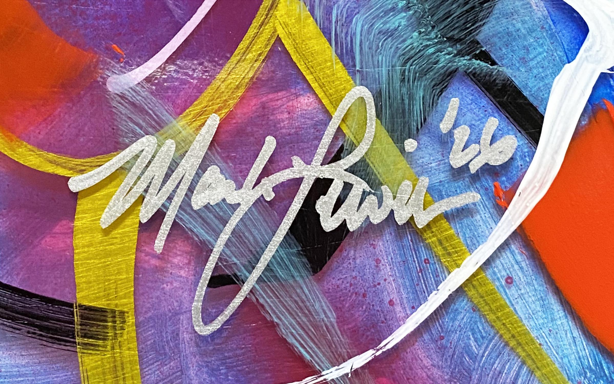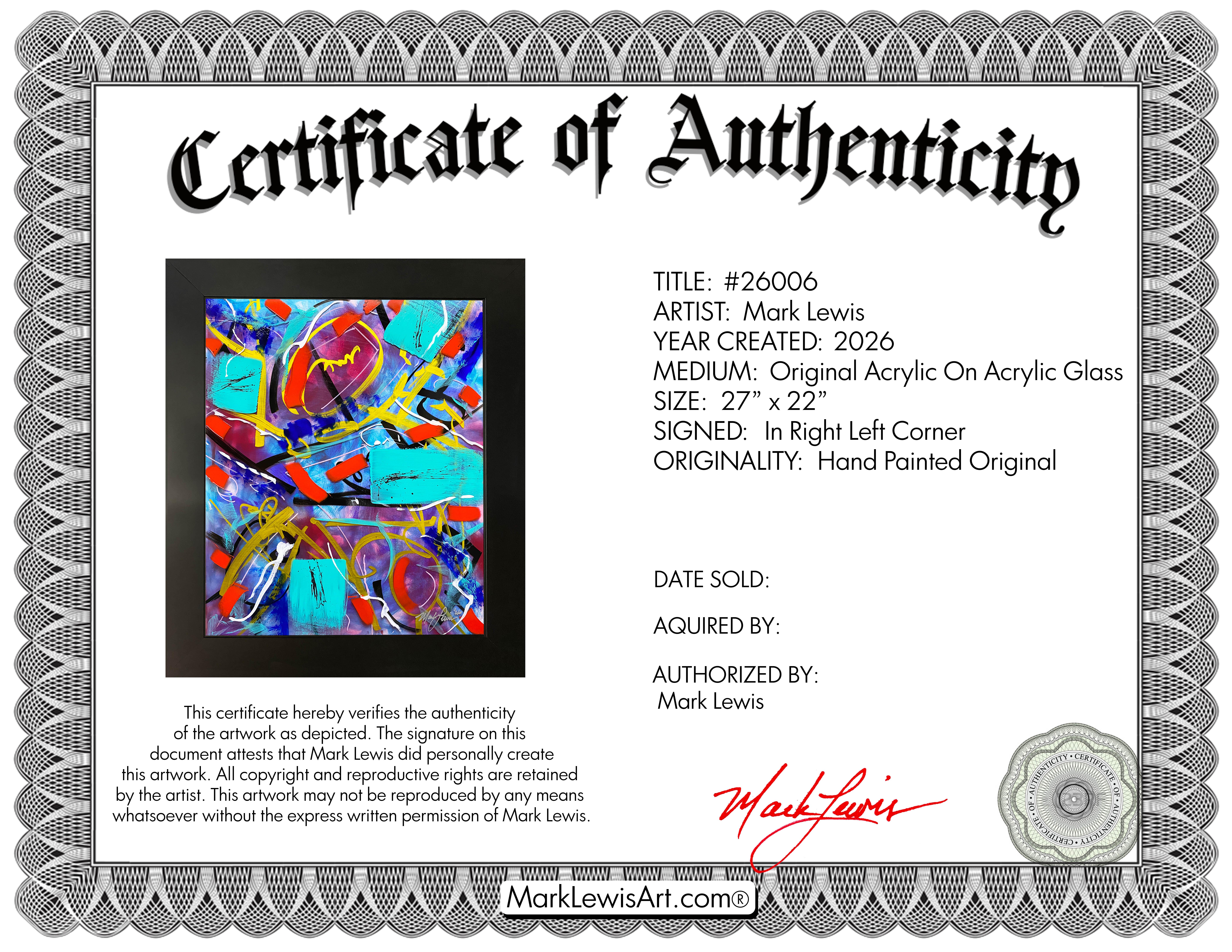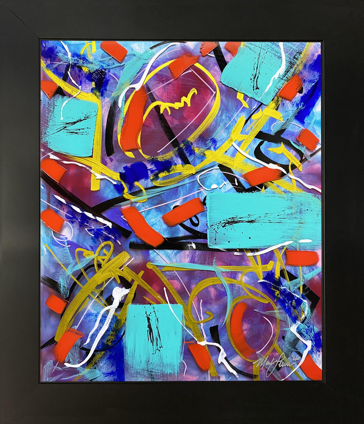 Evaluation: A high-energy masterclass in modern abstract expressionism, this piece vibrates with a kinetic, neon-infused palette. Created by Mark Lewisgreat-grand-nephew of MLB legend Cy Youngthe work features a complex layering of electric turquoise, fiery orange, and deep violet. Thick, gestural strokes and energetic black lines create a sense of organized chaos, while white "splatter" accents provide a crisp, rhythmic contrast. Painted directly onto premium acrylic glass, the piece achieves a luminous 3D depth where bold colors appear to float with a glossy, glass-like finish. It is a striking exploration of movement and light, bridging a storied American lineage with contemporary urban energy.
