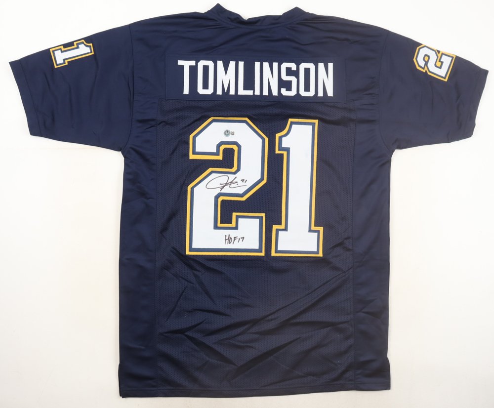Custom jersey. Everything sewn on, size XL. Hand-signed and inscribed by LaDainian Tomlinson (HOF).