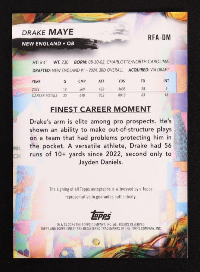 Drake Maye 2024 Finest Rookie Autographs #RFADM RC