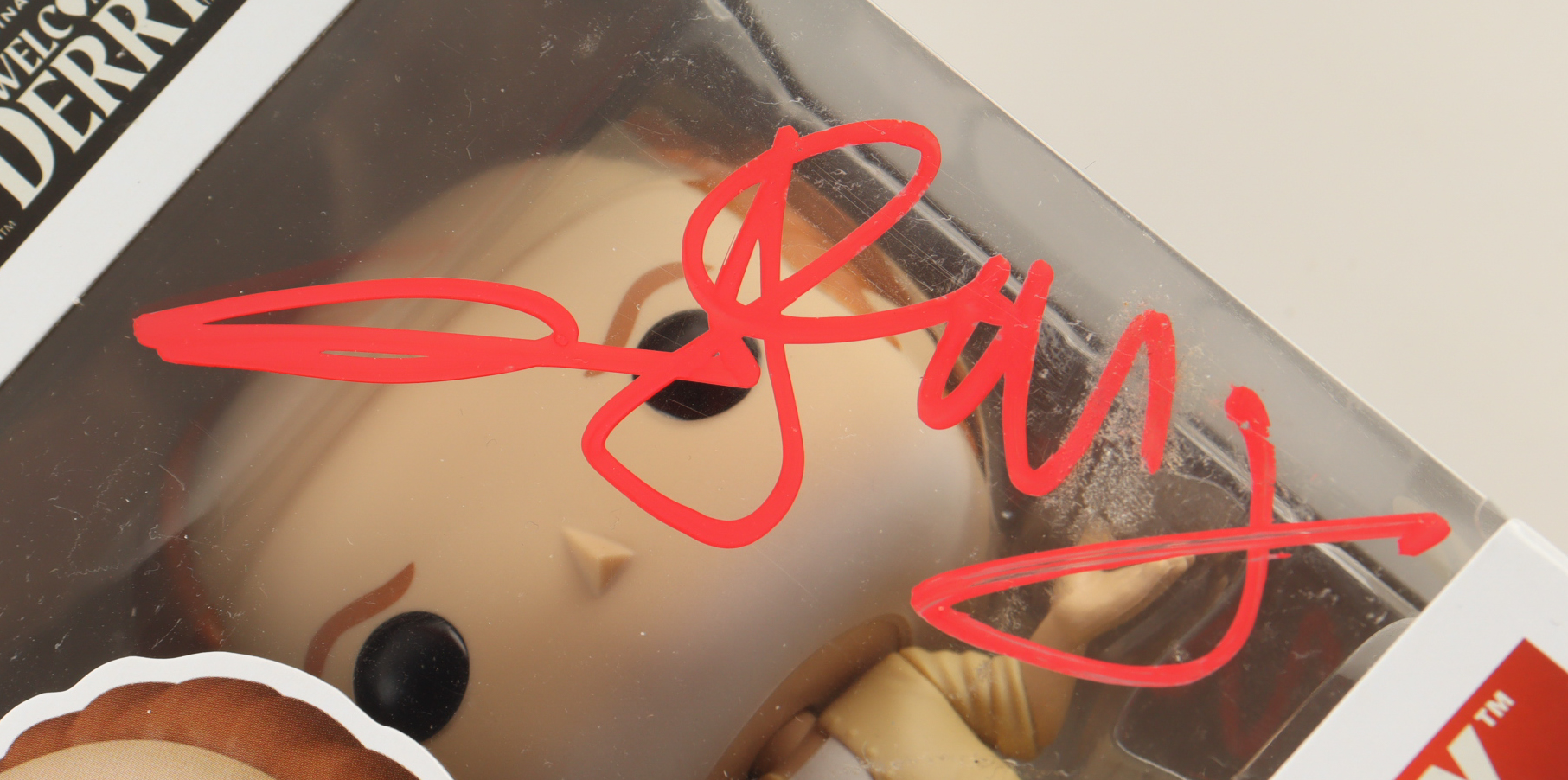 Vinyl figure measures approximately 4" tall and has been hand-signed on the packaging by Andy Muschietti. Please note the window has been swapped, there is residue on the packaging, and the signature is scratched - see photos for more details.