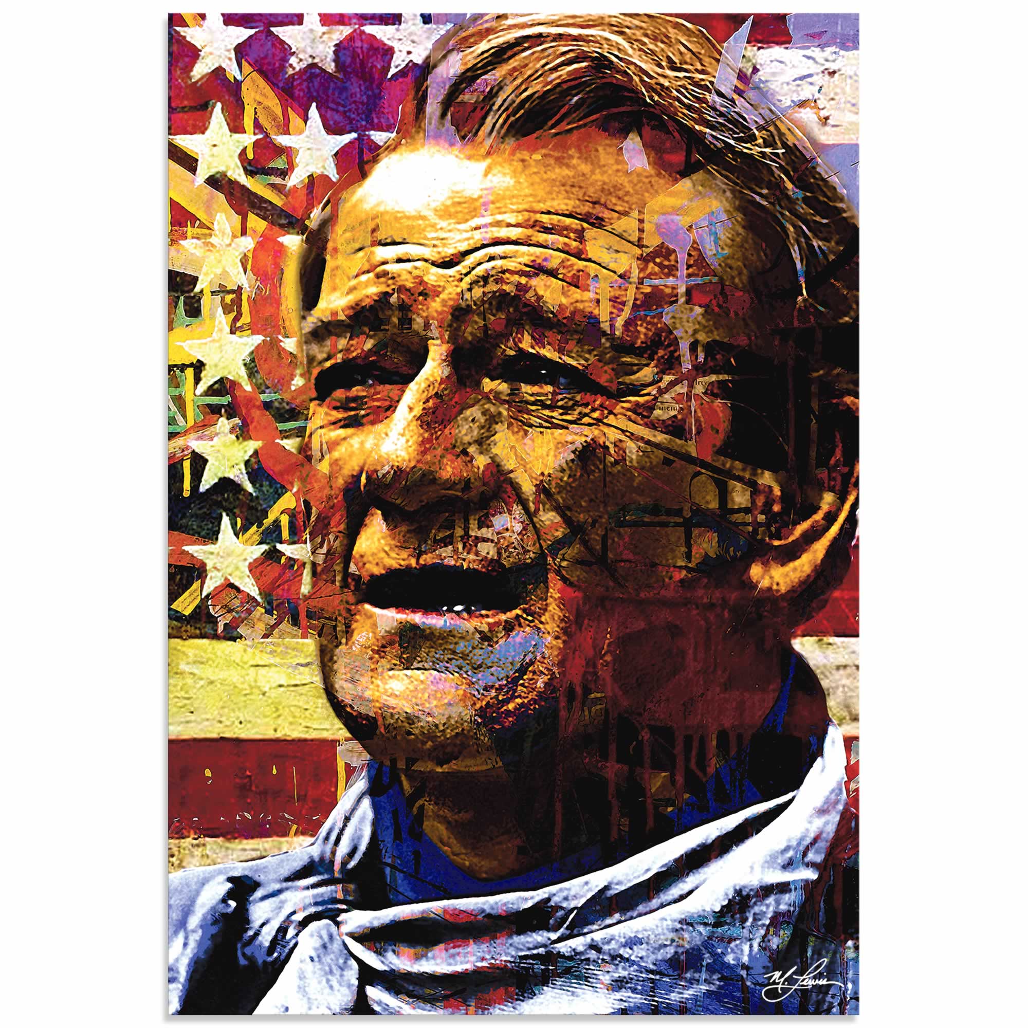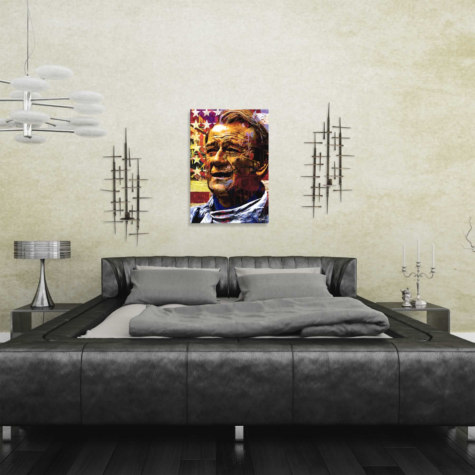 John Wayne pop art by Mark Lewis. The 'John Wayne Faded Glory' ultra high definition, fine art giclée boasts the raw emotion, bold colors, palette knife style and paint-splatter detail that has made Mark Lewis a star and a world-renowned pop artist. His original paintings are featured in art galleries, private collections, and high end art auction houses around the world. This John Wayne wall art is a gorgeous tribute and a striking artwork for an urban, eclectic or contemporary decorator.