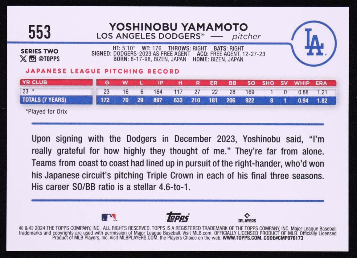 Yoshinobu Yamamoto 2024 Topps #553 RC