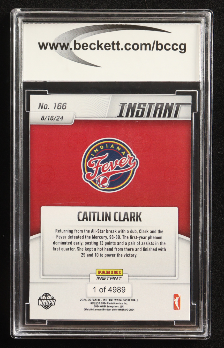 Caitlin Clark 2024 Panini Instant WNBA #166 4989 RC (BCCG 9)