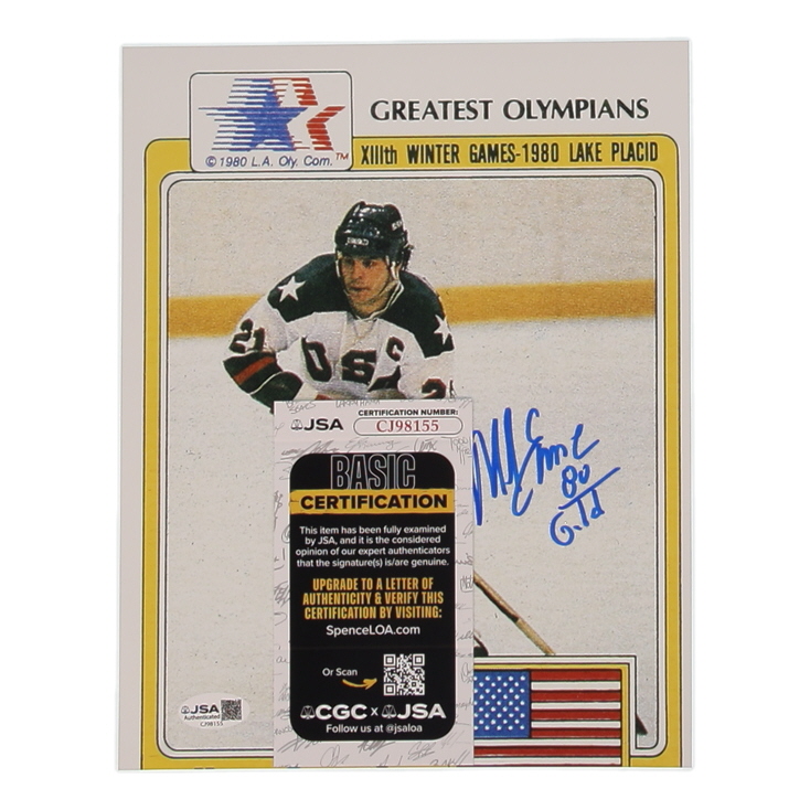 Photo measures 8" x 10" in size and has been hand-signed and inscribed by Mike Eruzione (Team USA).