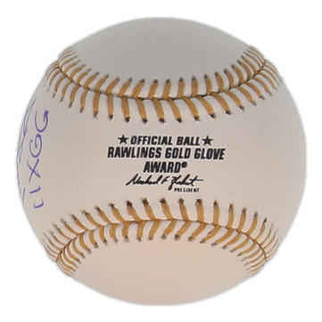 Rawlings Gold Glove Award baseball has been hand-signed and inscribed by Omar Vizquel (Cleveland Indians).