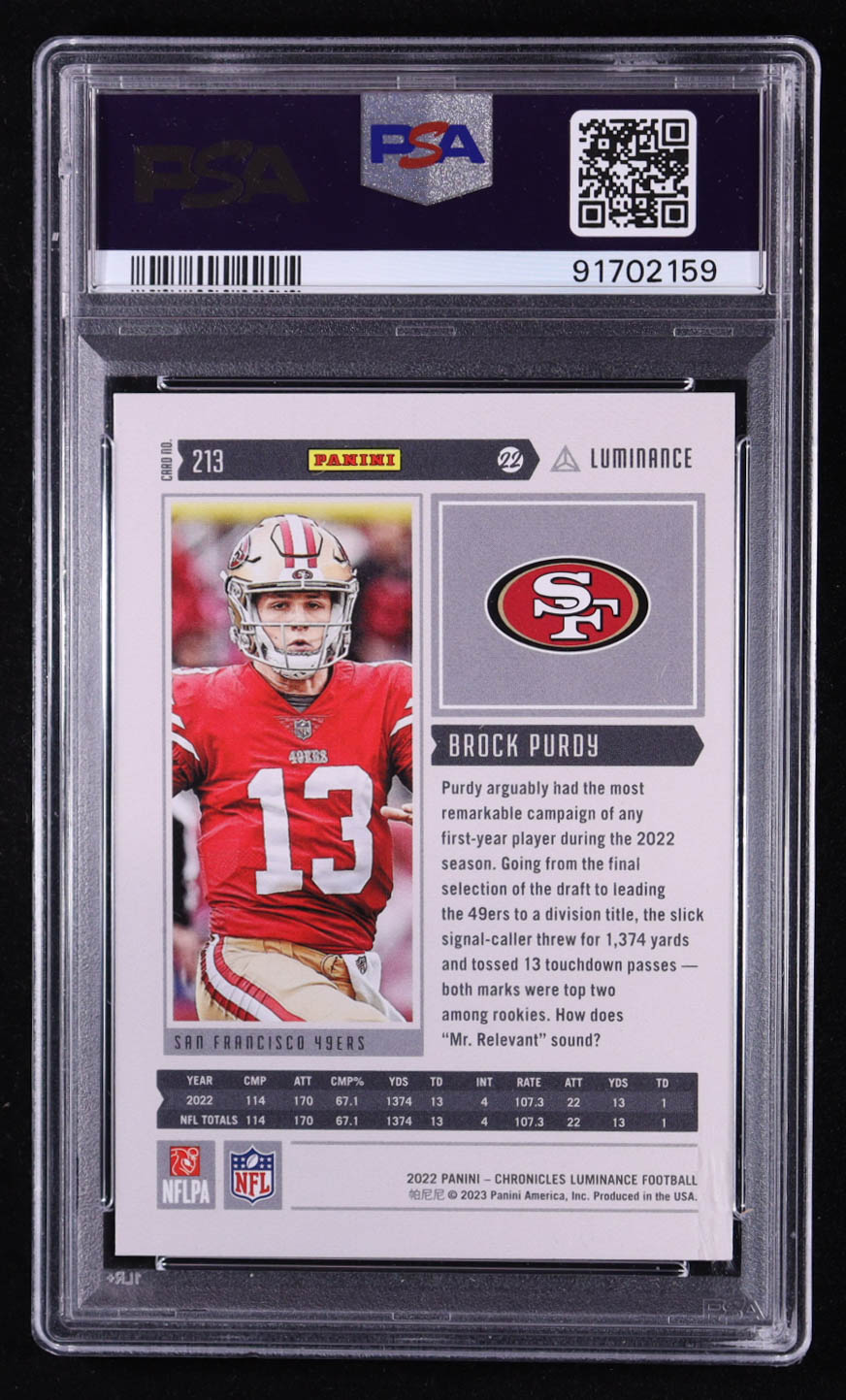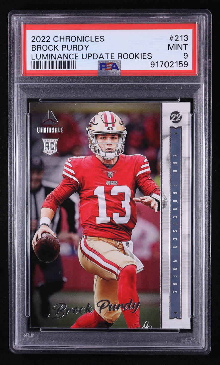 Brock Purdy 2022 Panini Chronicles Luminance Update Vertical Rookies #213 RC (PSA 9)