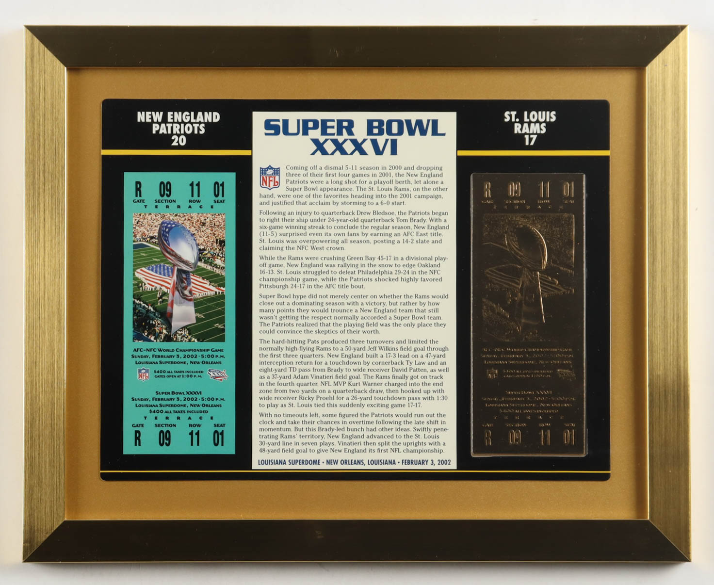 Super Bowl XXXVI Commemorative Score Card with 23KT Gold Ticket Framed Display