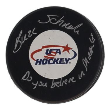 Buzz Schneider Signed Team USA Logo Hockey Puck Inscribed "Do You Believe In Miracles" (Beckett)