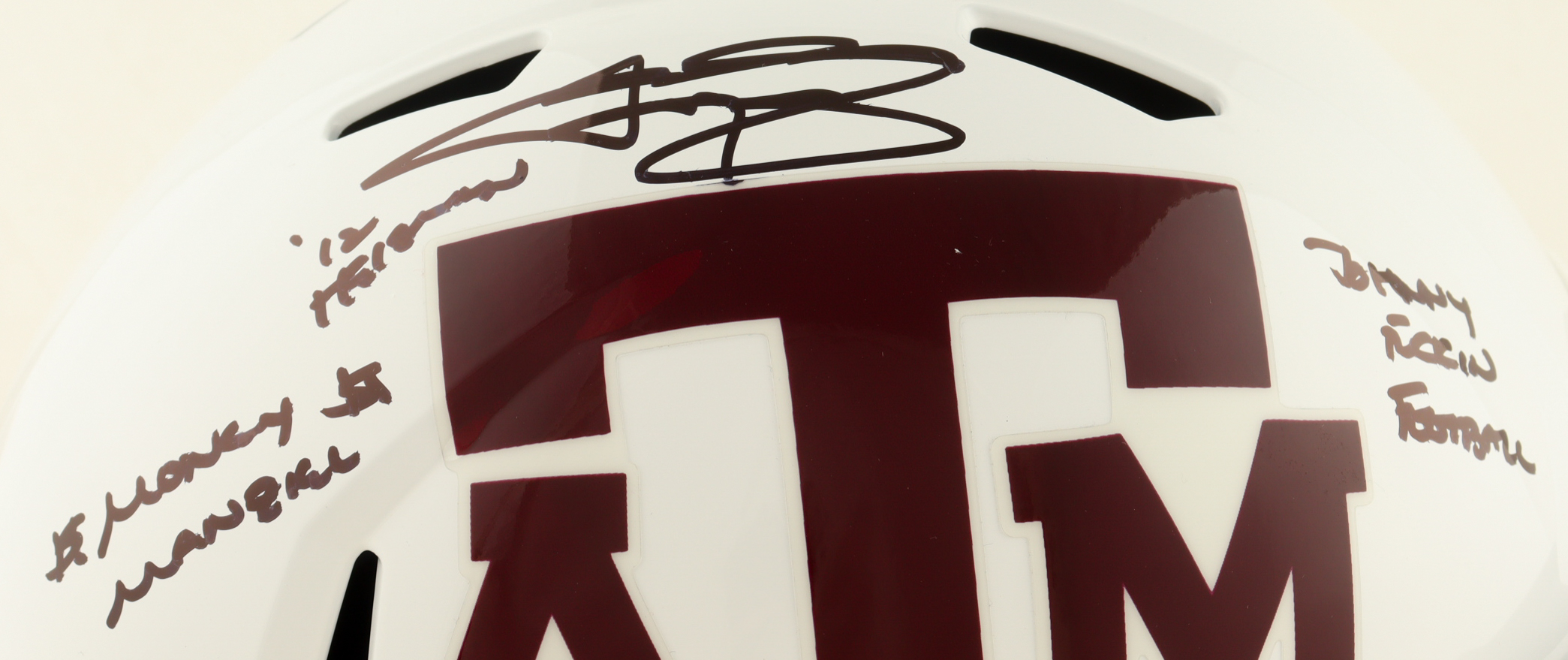 Riddell Texas A&M Aggies full-size speed replica helmet has been hand-signed and inscribed by Johnny Manziel.