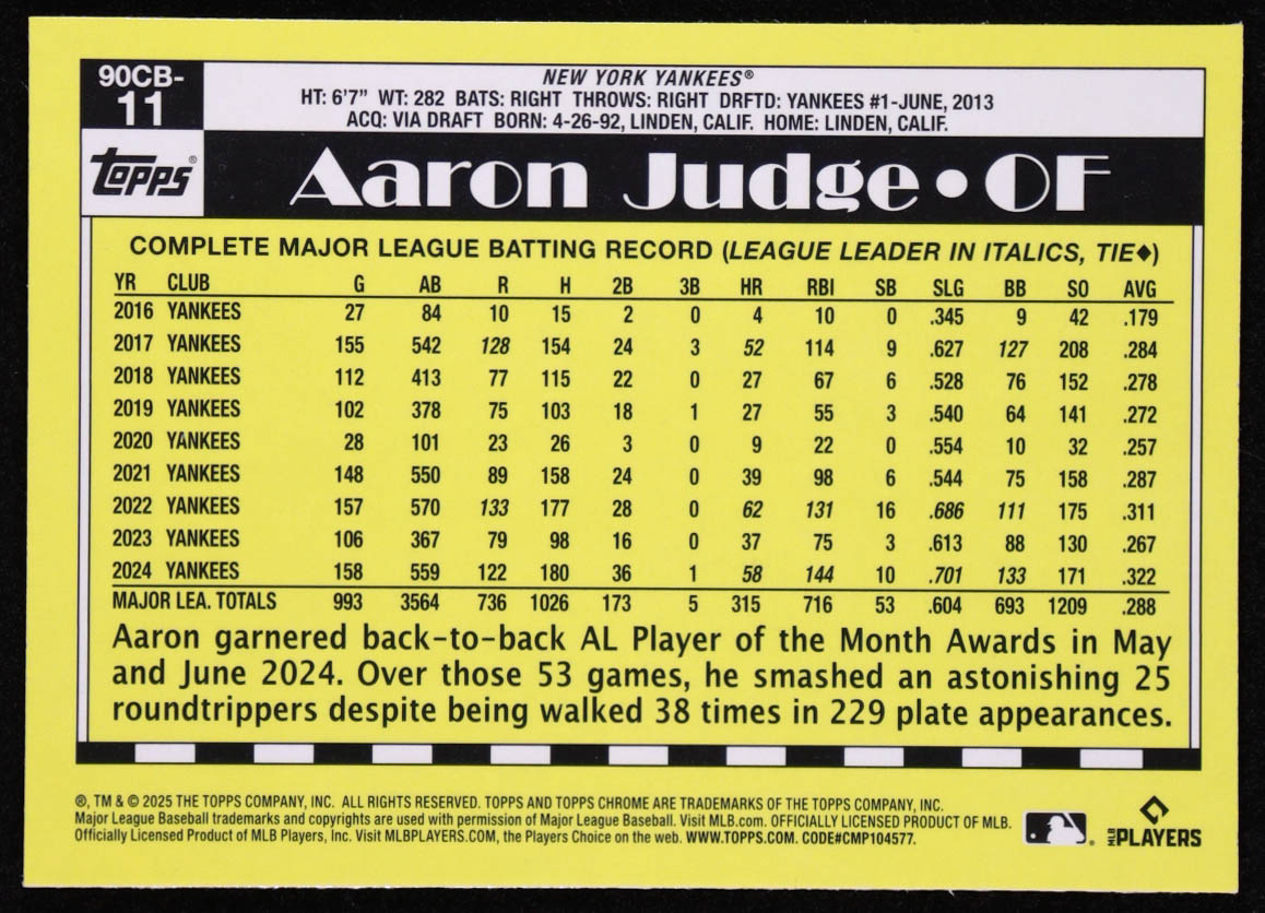 Aaron Judge 2025 Topps Chrome '90 Topps #90CB11