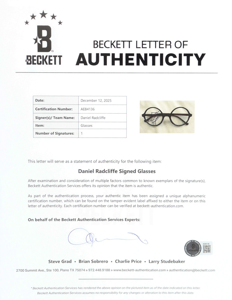 Daniel Radcliffe Signed "Harry Potter" Replica Glasses (Beckett)