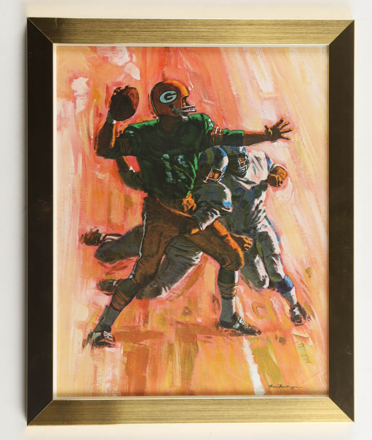 Frame measures approximately 13" x 16" in size. Featuring an 11" x 14" art print by Bruce Bomberger (D. 1980) of Bar Starr (D. 2019, Green Bay Packers, HOF). Please note that the item is unsigned.