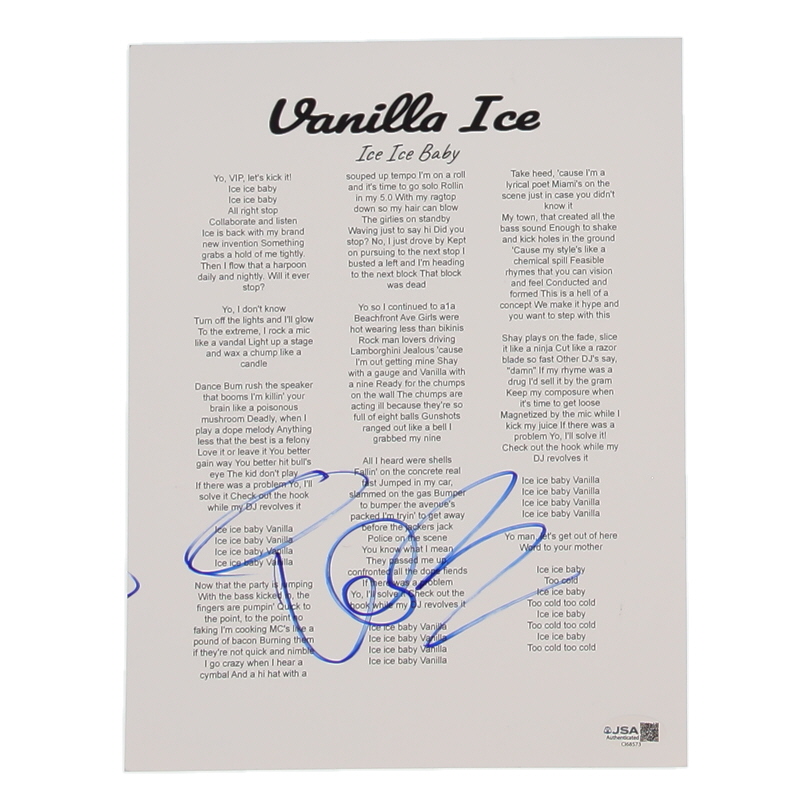 Lyric sheet measures approximately 8.5" x 11" in size. Hand-signed by Vanilla Ice.