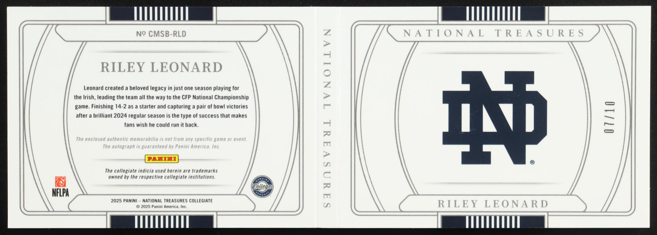 Riley Leonard 2025 Panini National Treasures Collegiate College Materials Signature Booklet Bowl Logo #5 #7/10 RC