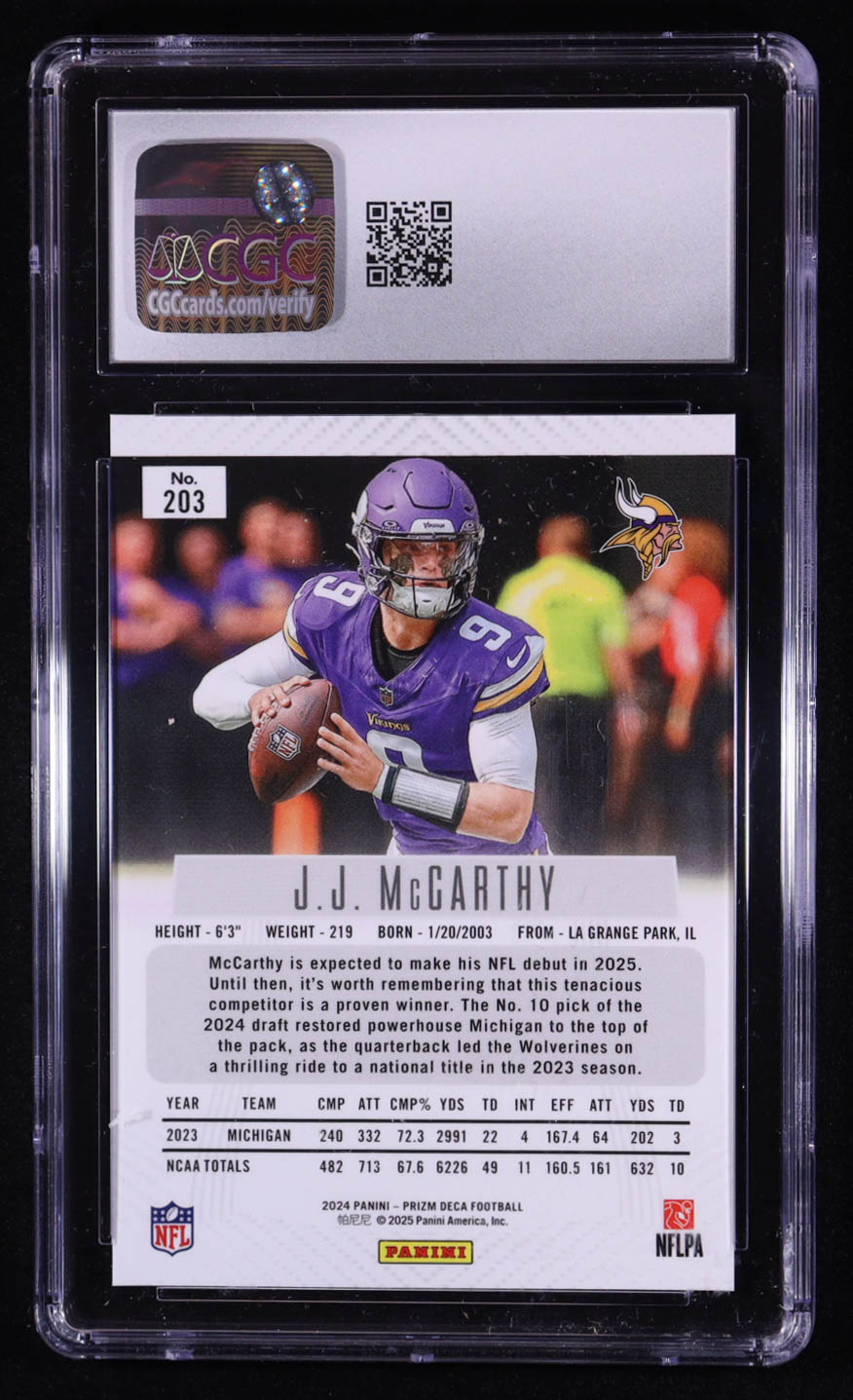 JJ McCarthy 2024 Panini Prizm Deca #203 RC (CGC 10)