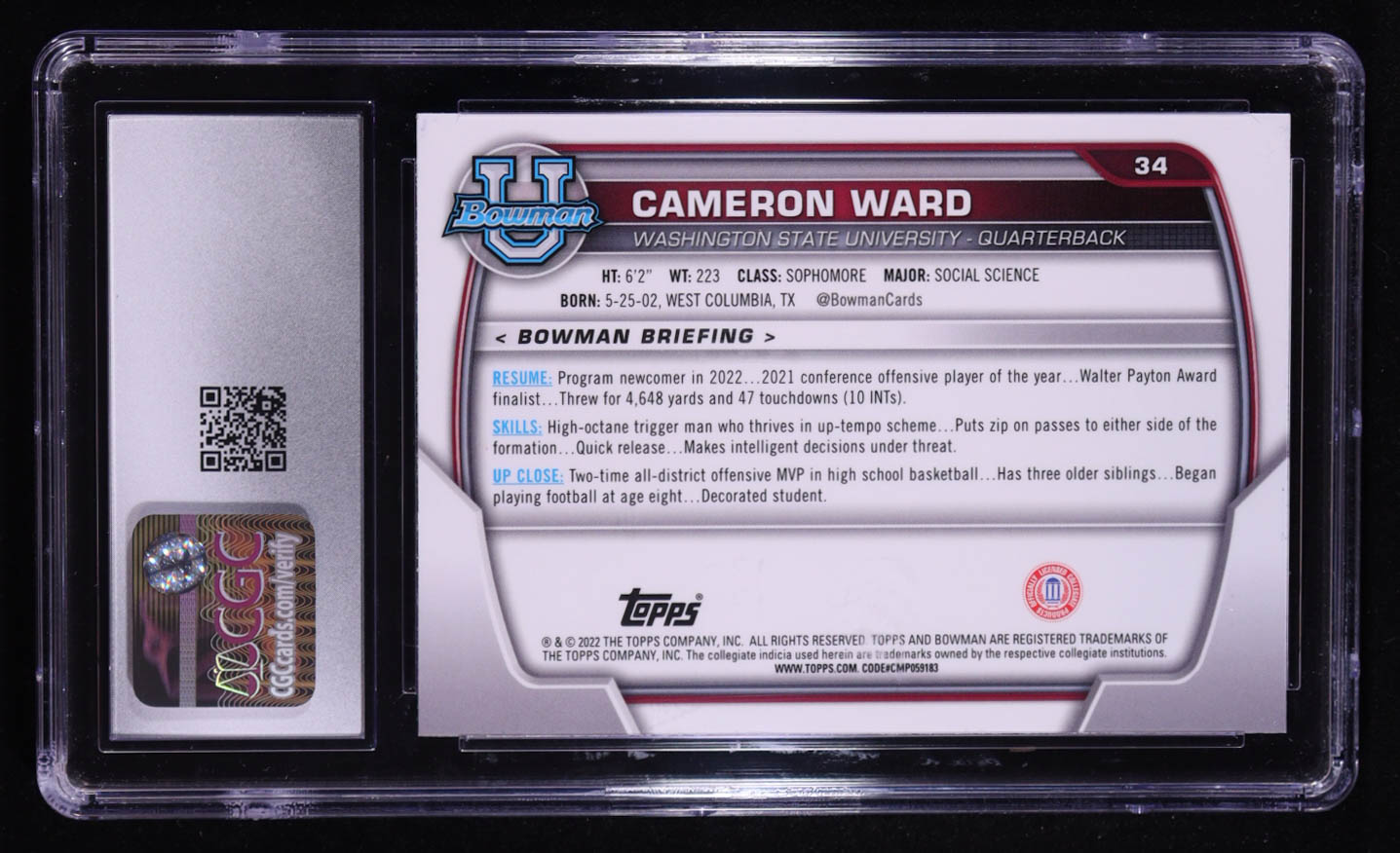 Cameron Ward 2022 Bowman Chrome University #34 (CGC 10)