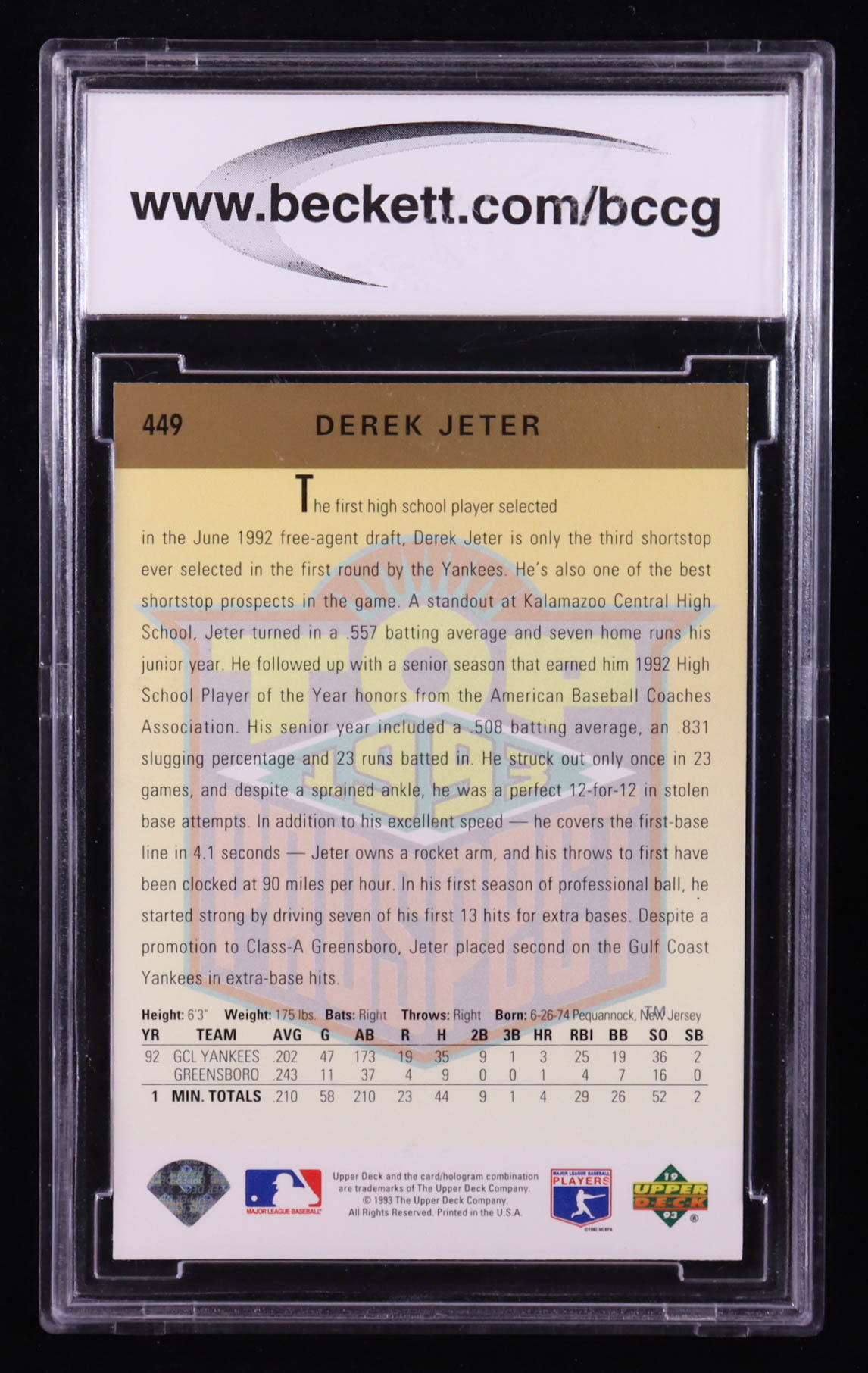 Derek Jeter 1993 Upper Deck #449 RC (BCCG 10)