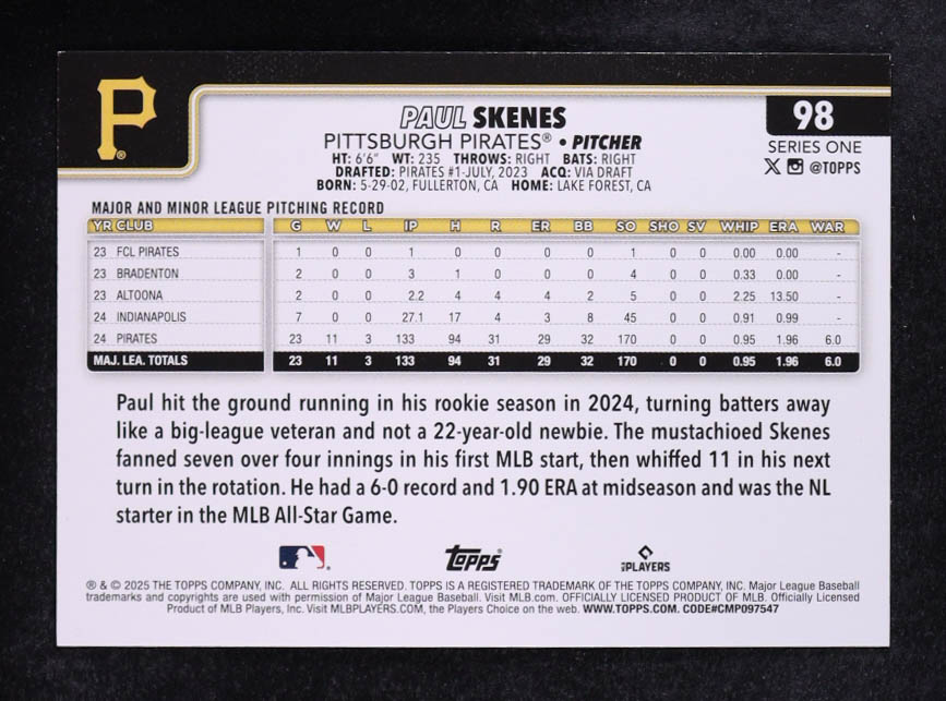 Paul Skenes 2025 Topps Pink Diamante Foil #98