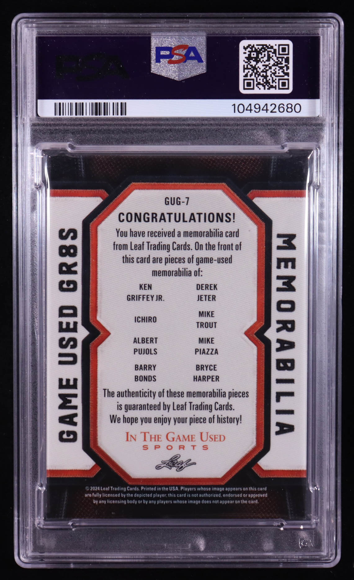 2024 In The Game Used GR8S Pink Holo #GUG-7 #05/15 Ken Griffey Jr. / Ichiro / Albert Pujols / Barry Bonds / Derek Jeter / Mike Trout / Mike Piazza / Bryce Harper (PSA 8)